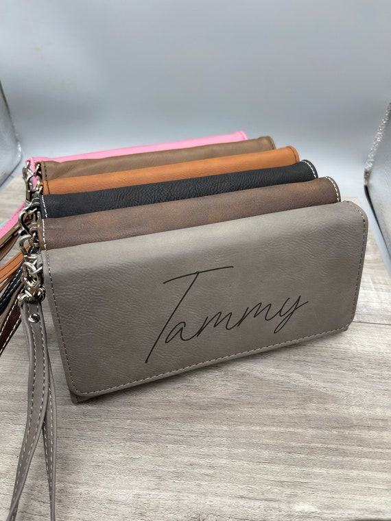 These women’s wallets are made from a high quality leatherette and laser engraved (no vinyl stickers or decals here!). It has room for 13 cards (including ID), large open compartment at the back, and a zipping compartment. It snaps shut, and includes a wrist strap. They are just over 7.5 inches wide and 4 inches tall when closed. Since we do our own engraving, we are able to offer a lot of flexibility on what’s engraved. We can even add dates if desired (great idea for Bridesmaids’ Gifts). Just message us with any special requests before ordering.