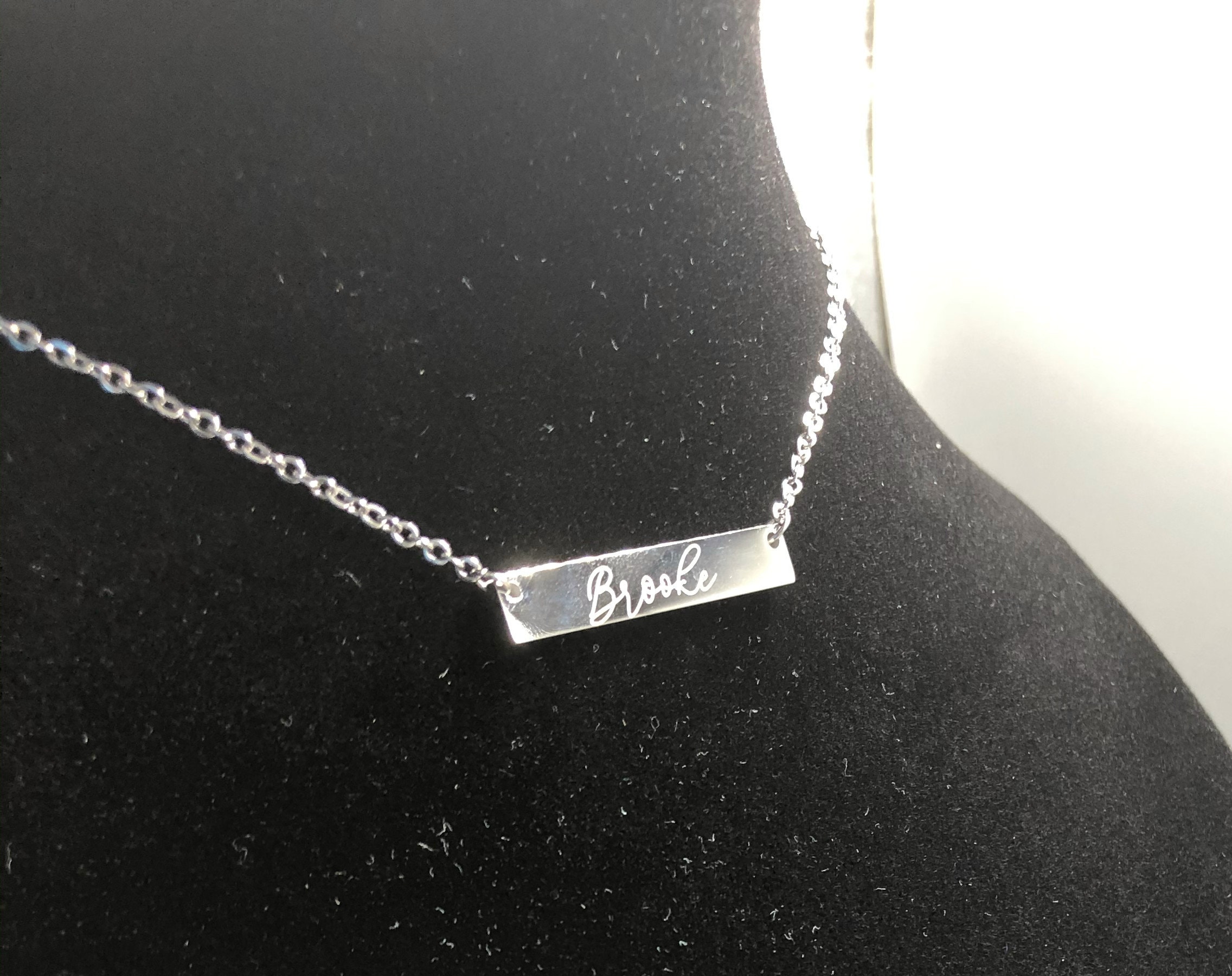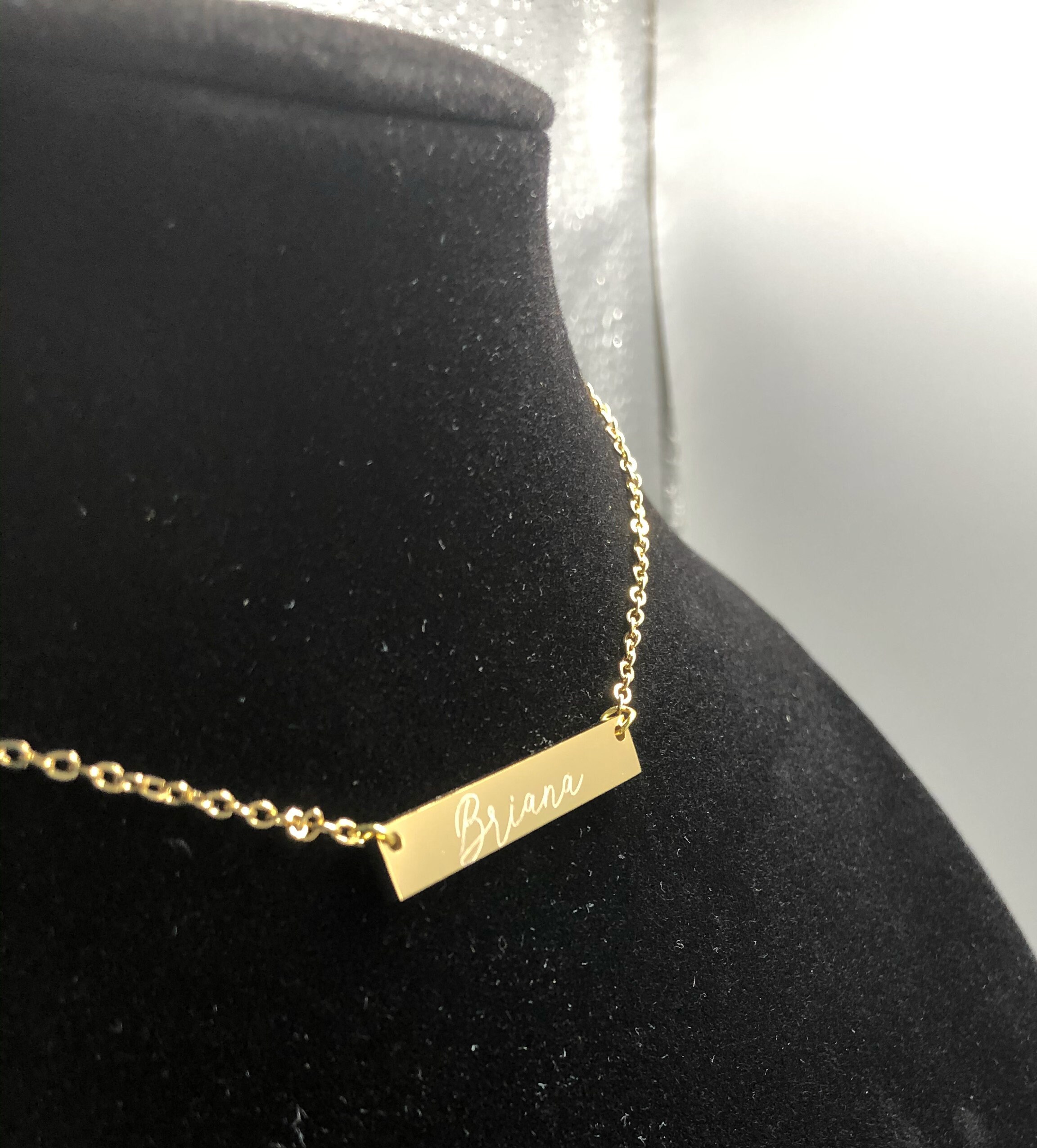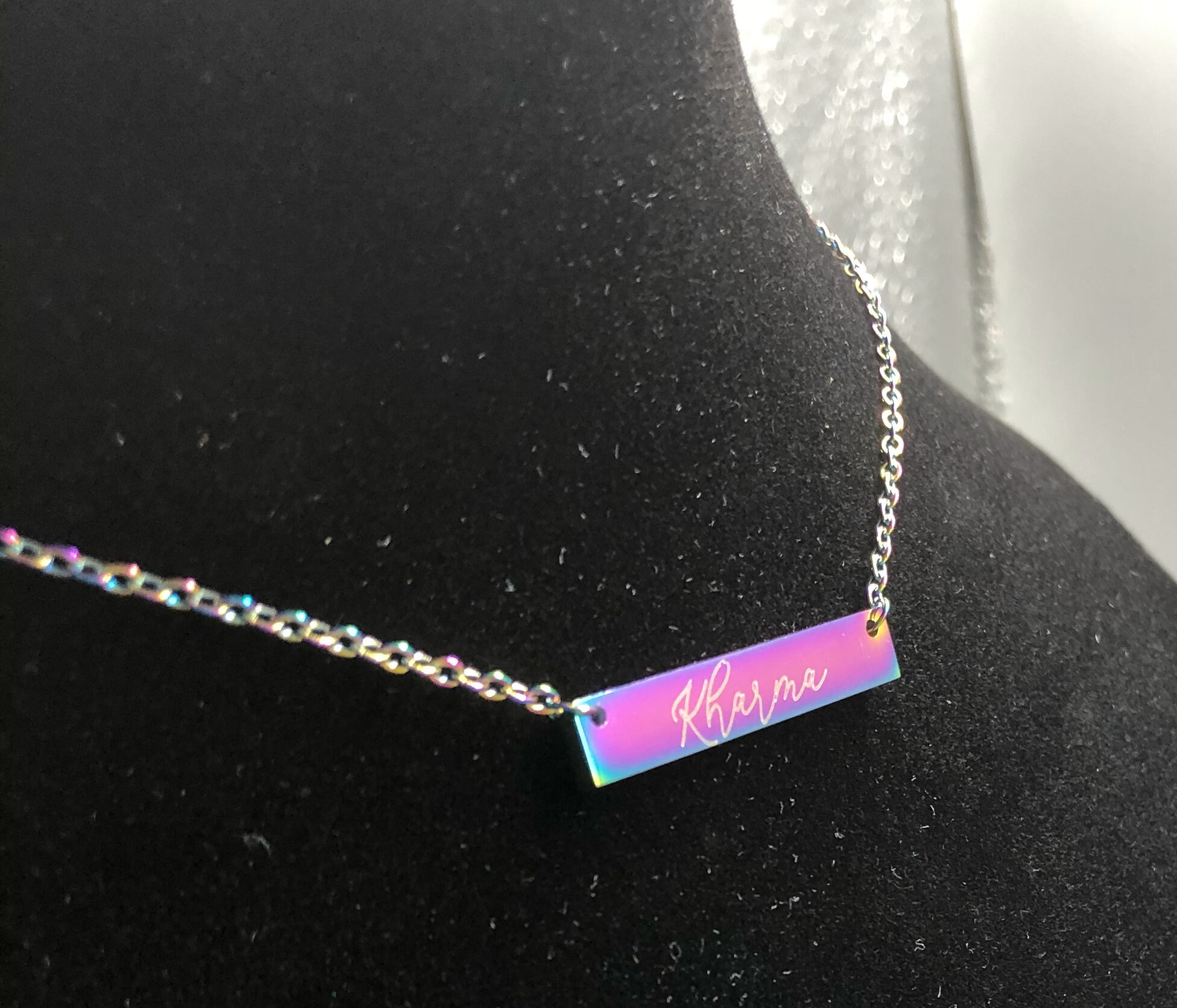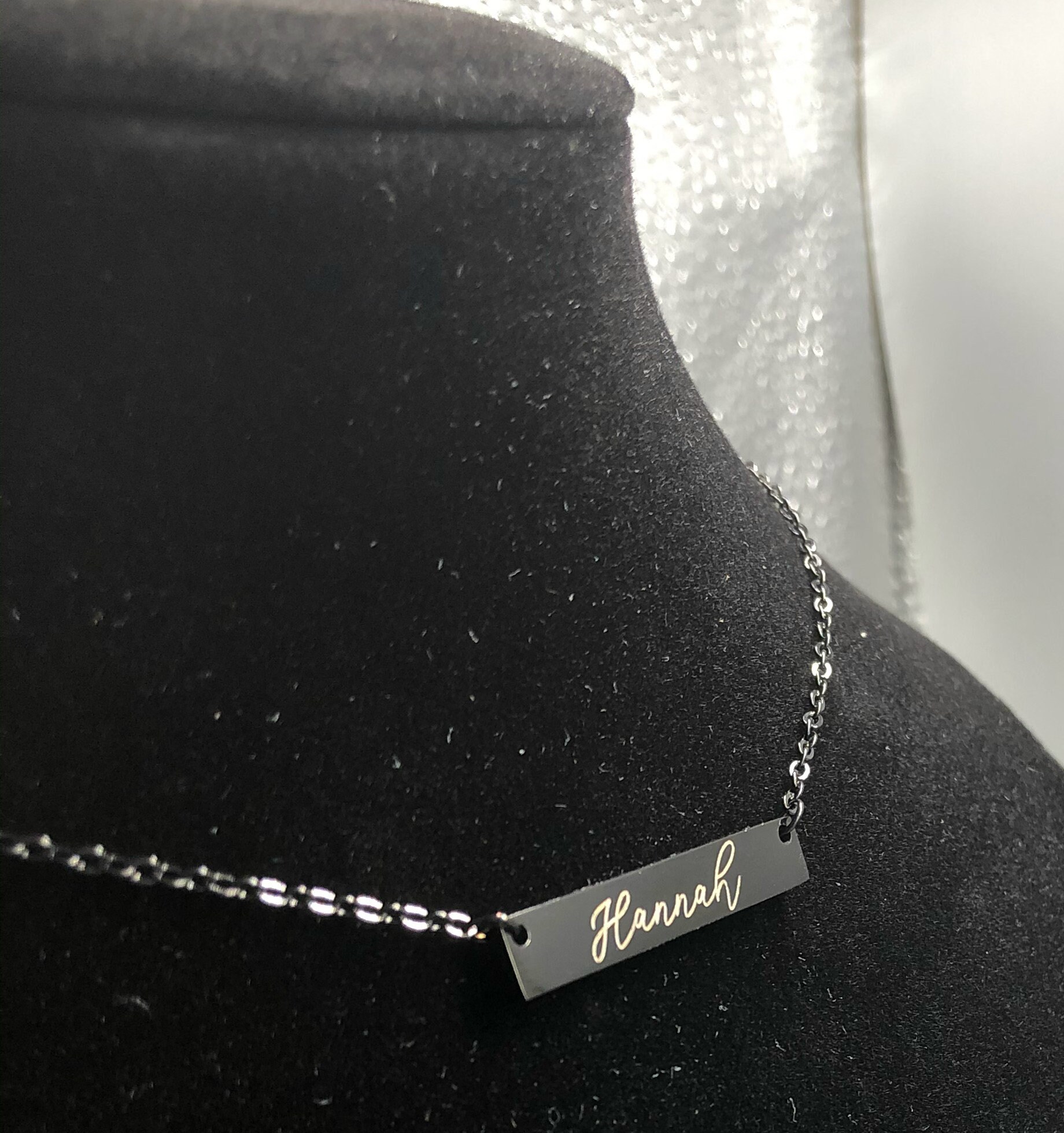 These bar necklaces come with a 20 inch chain. They are made with a stainless steel core, and available in 5 colors: Gold, Rose Gold, “Rainbow”, Black, and Silver. We use a beautiful font that simulates real handwriting. We currently only engrave these with a name or date; only one per side. If you would like a name AND a date, or 2 names, they must be engraved on the front and back. Please limit the engraving to 12 characters per side (if a name is a couple characters longer, please message us first so we can check to see if it will fit without distorting the text)
