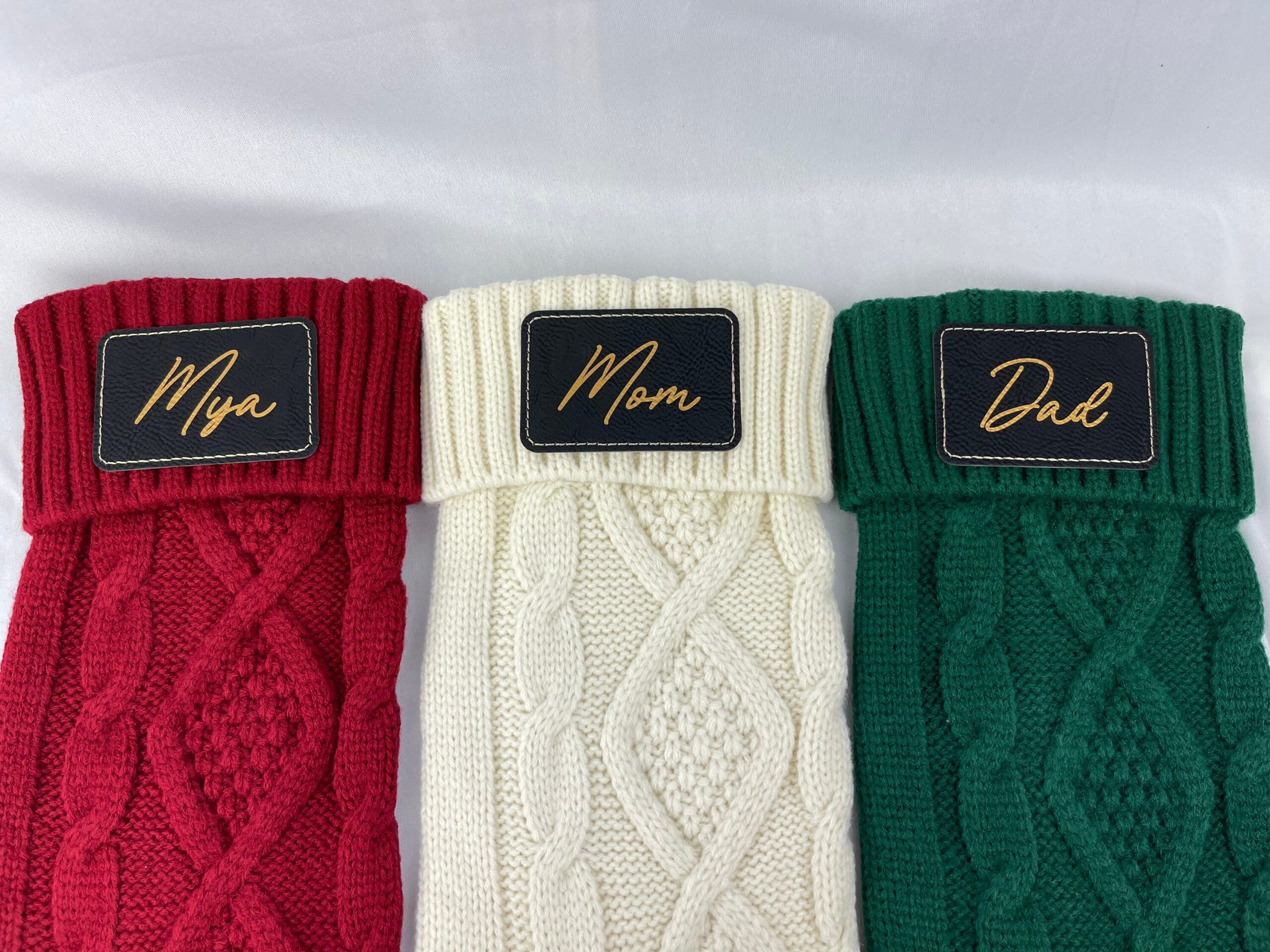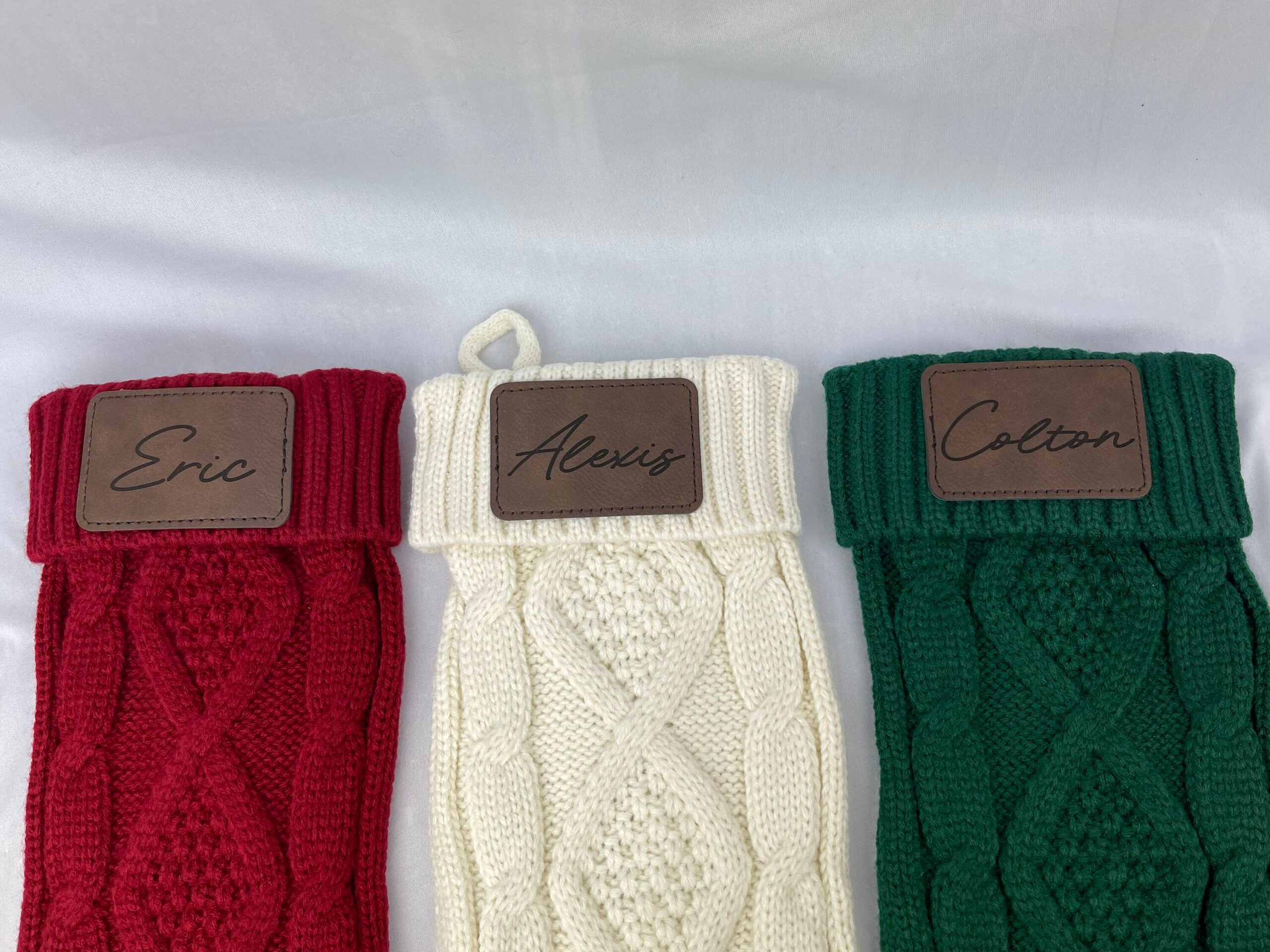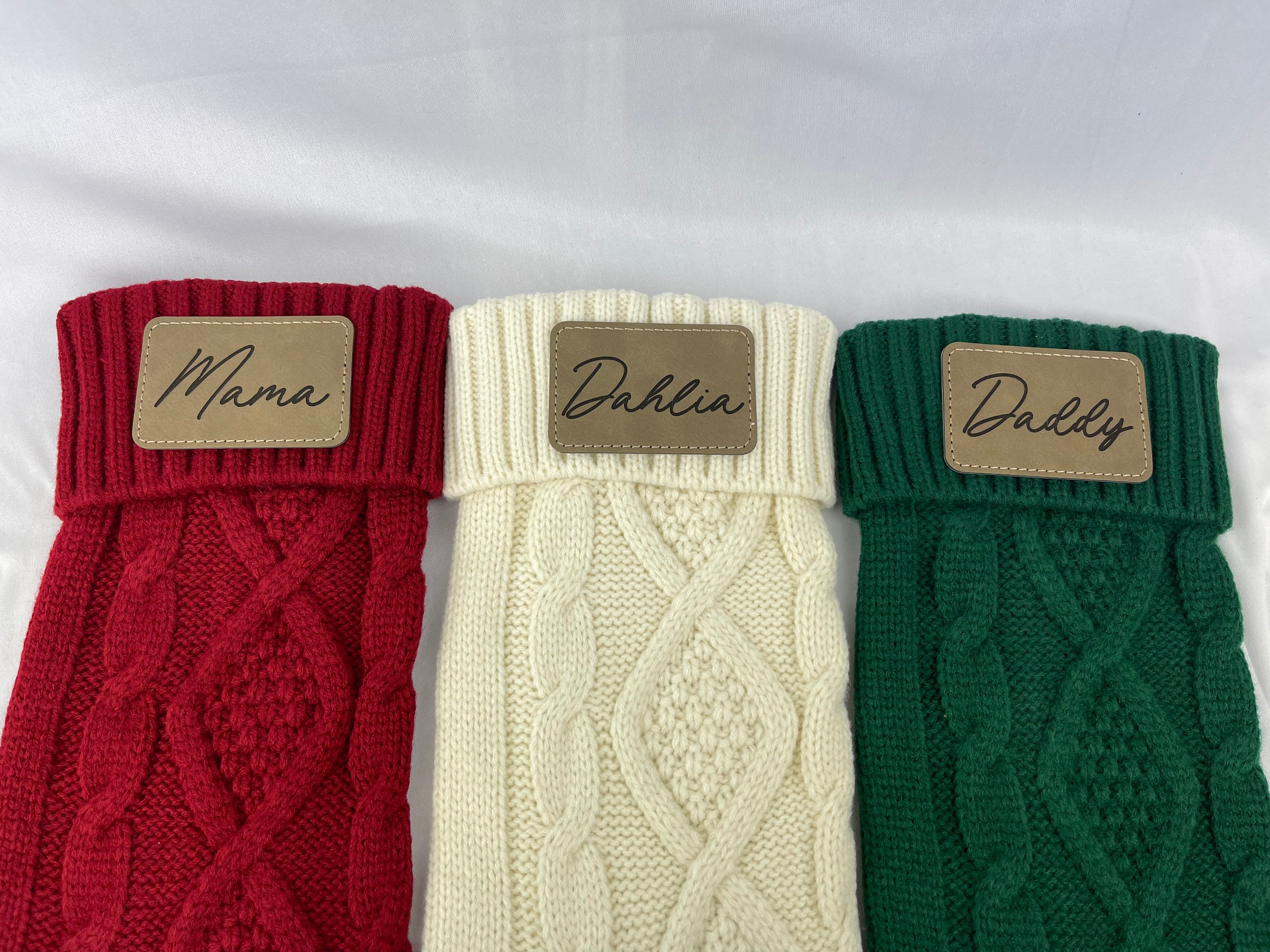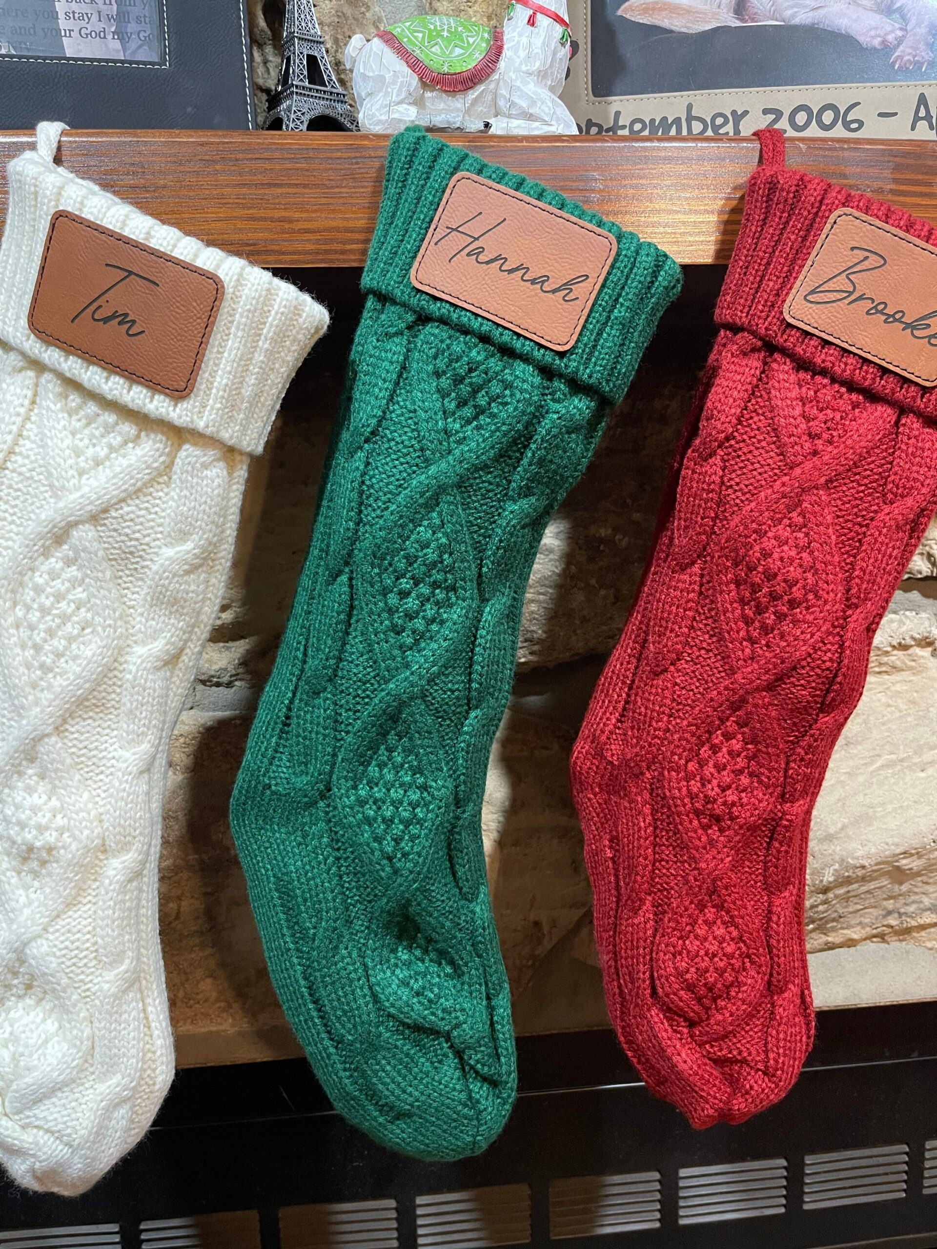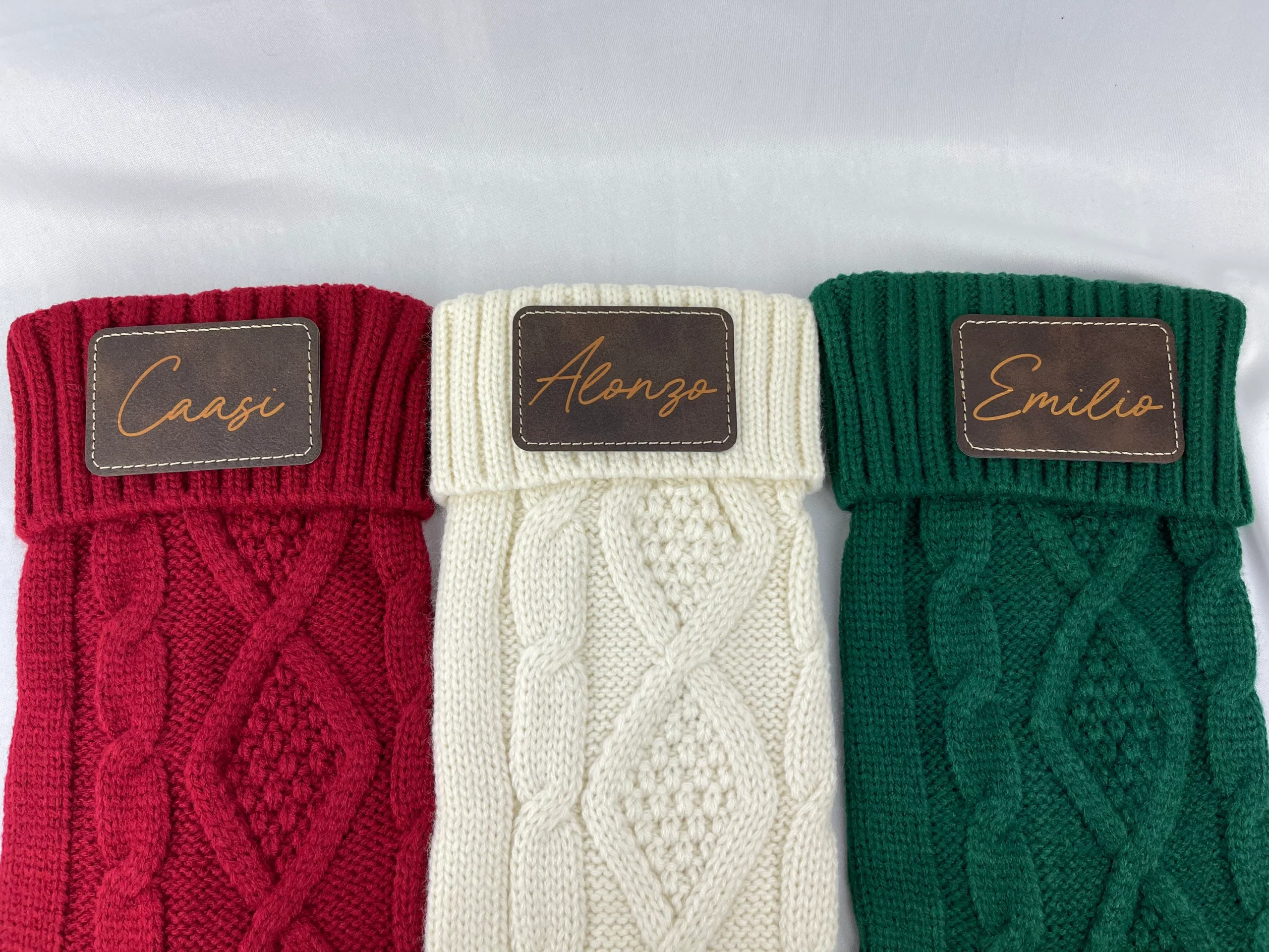 The leatherette patches are available in several color options: Rawhide (shown in main photo), Light Brown, Dark Brown, and Gray all engrave text in black; Black with engraved text in either silver or gold; and Rustic Brown with text engraved in gold. We also have red, pink, and teal that engrave text in black, but the colors really don’t match with the stockings well, so we don’t have them listed. Photos of those colors are available on request.