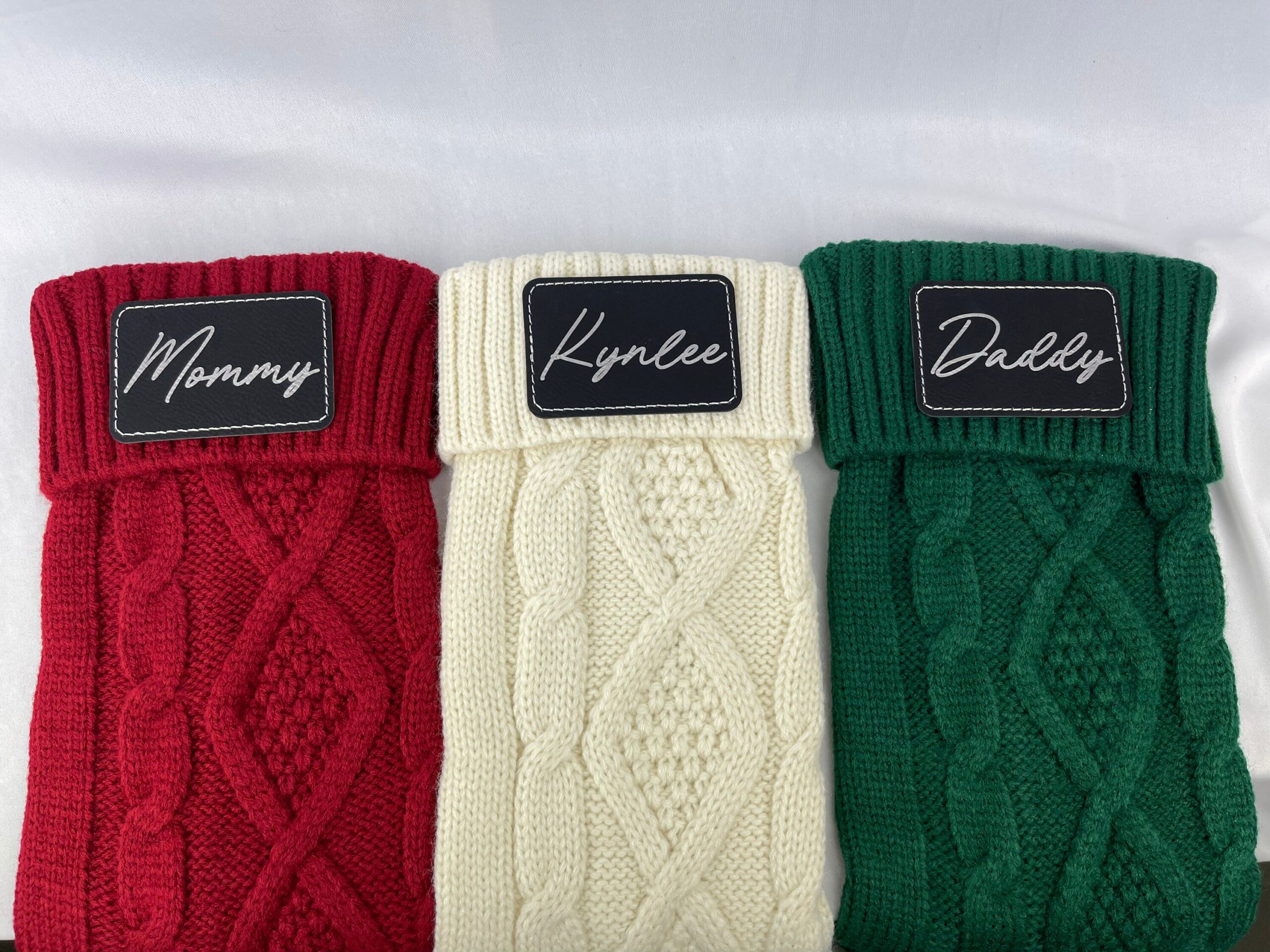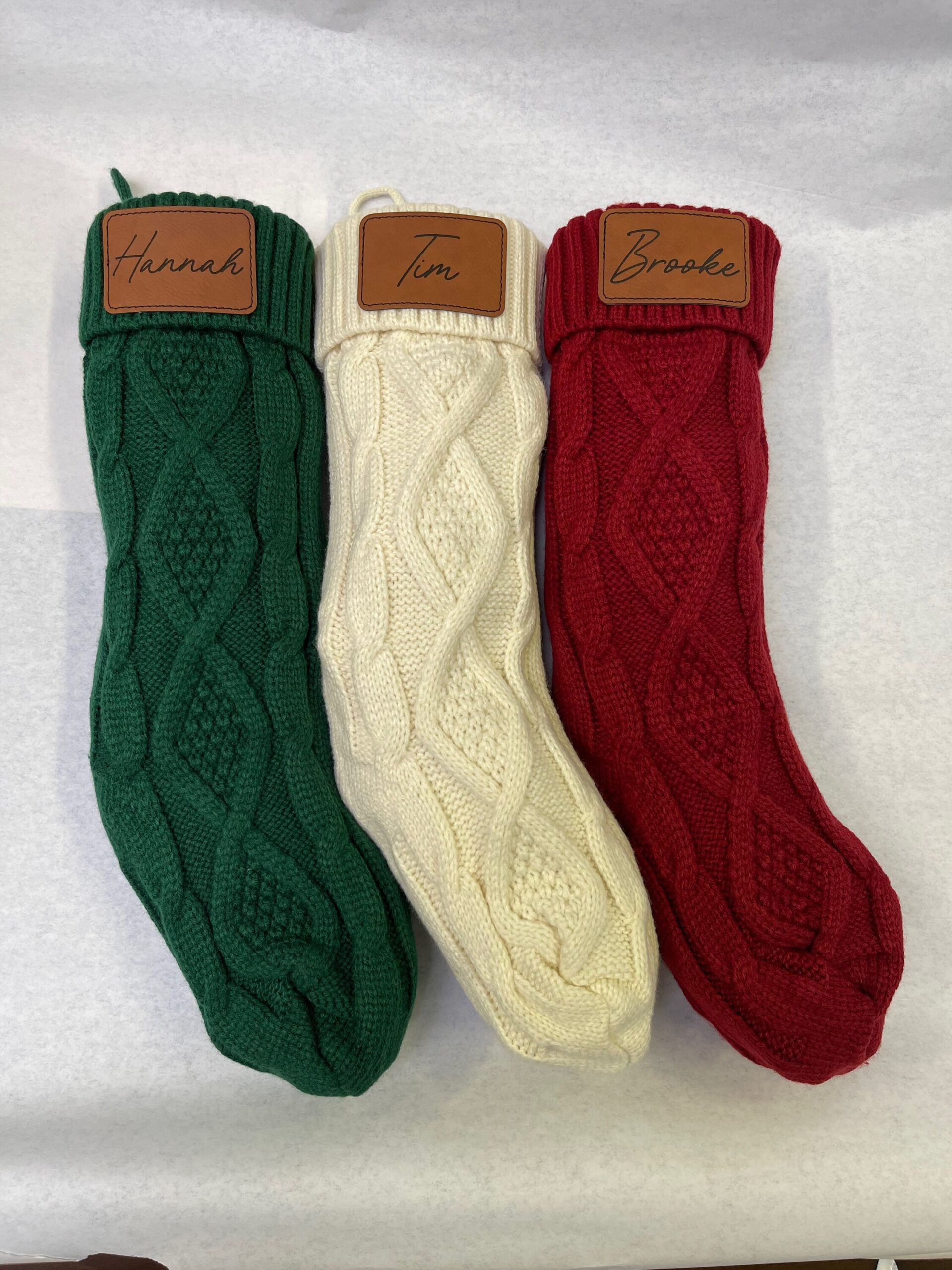 These knit Christmas Stockings come in 3 colors: Red, Green, and Cream. Each is approximately 18 inches long and 5 inches wide.