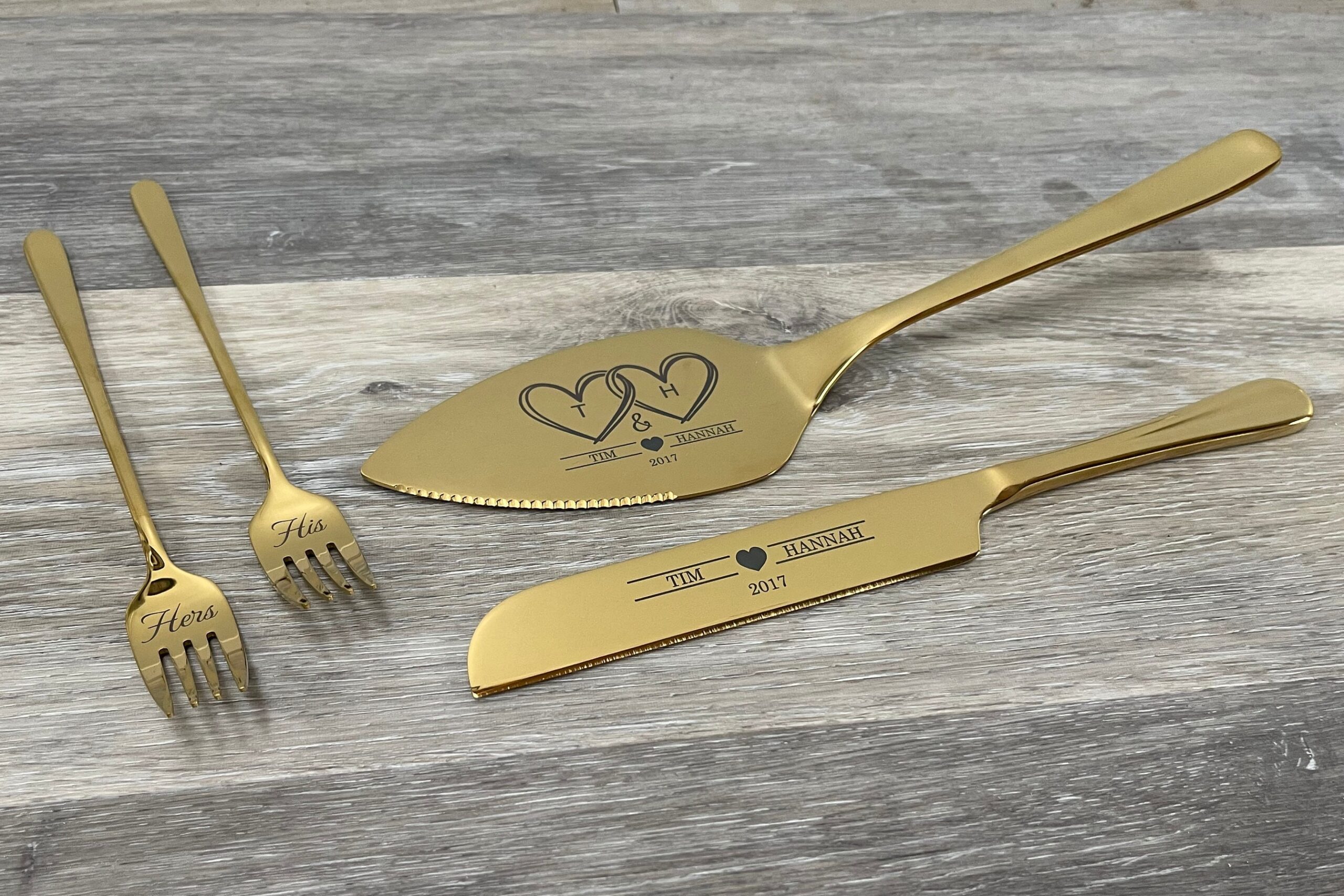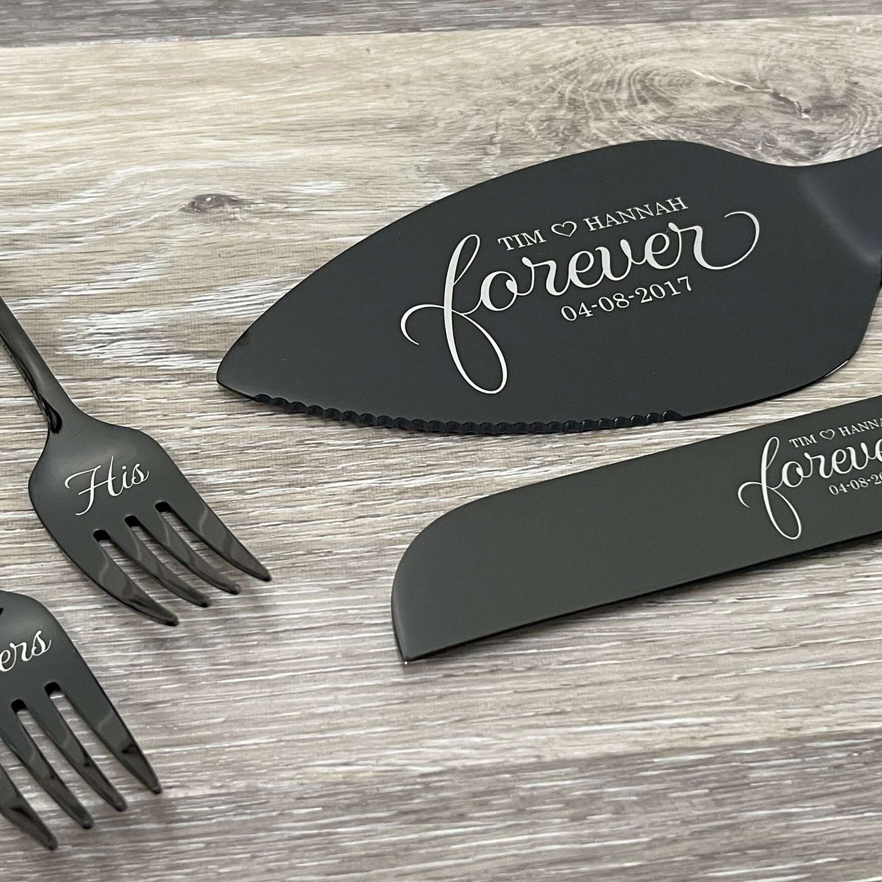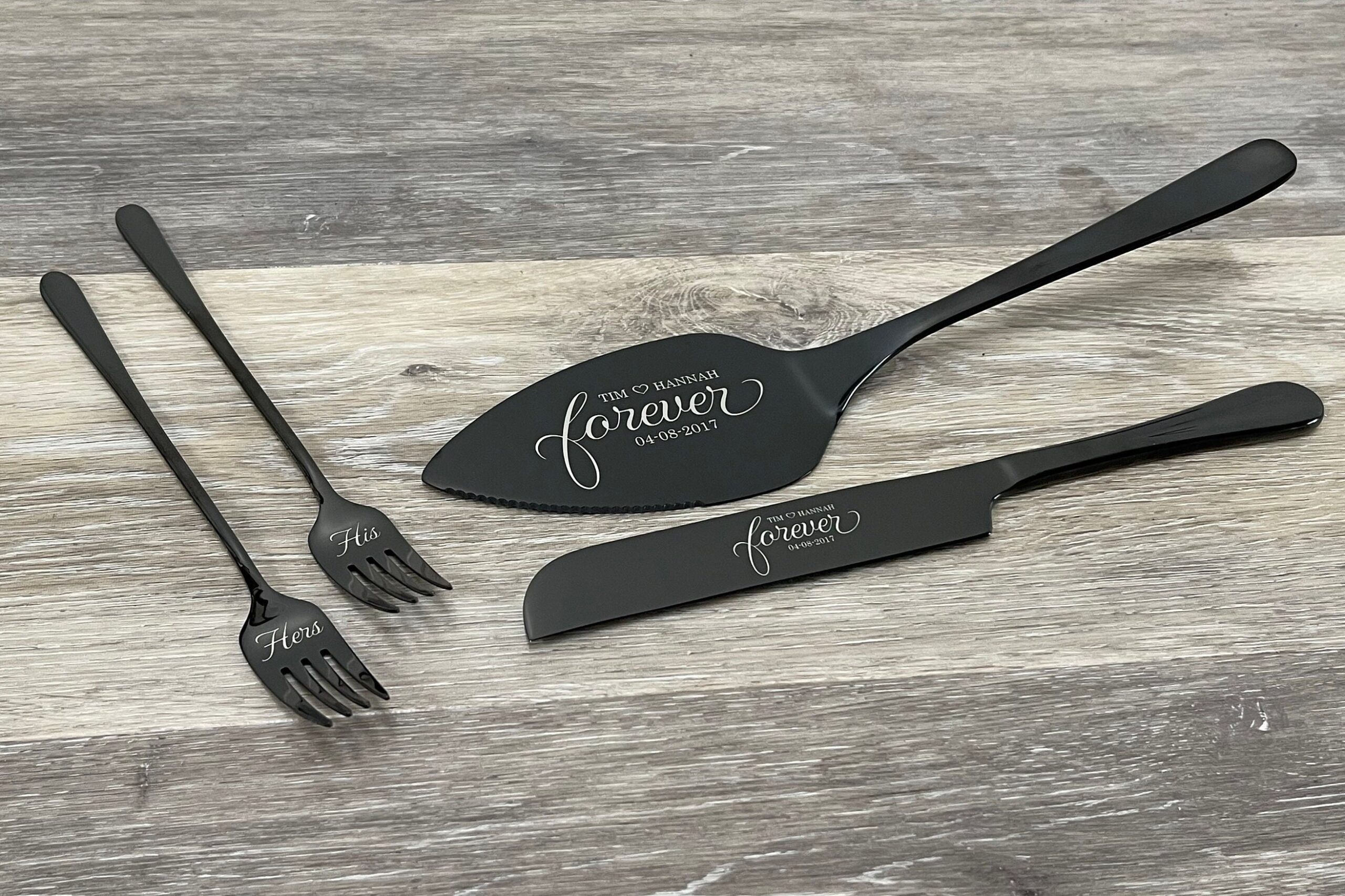 Presenting our beautiful custom engraved cake knife and server sets with 2 dessert forks, perfect for adding an extra touch of elegance to your special celebrations! Choose from our selection of premade designs or submit your own design for a truly unique keepsake. Available in 4 stunning colors, these sets make a thoughtful and personalized gift for weddings, anniversaries, birthdays, or any momentous occasion.