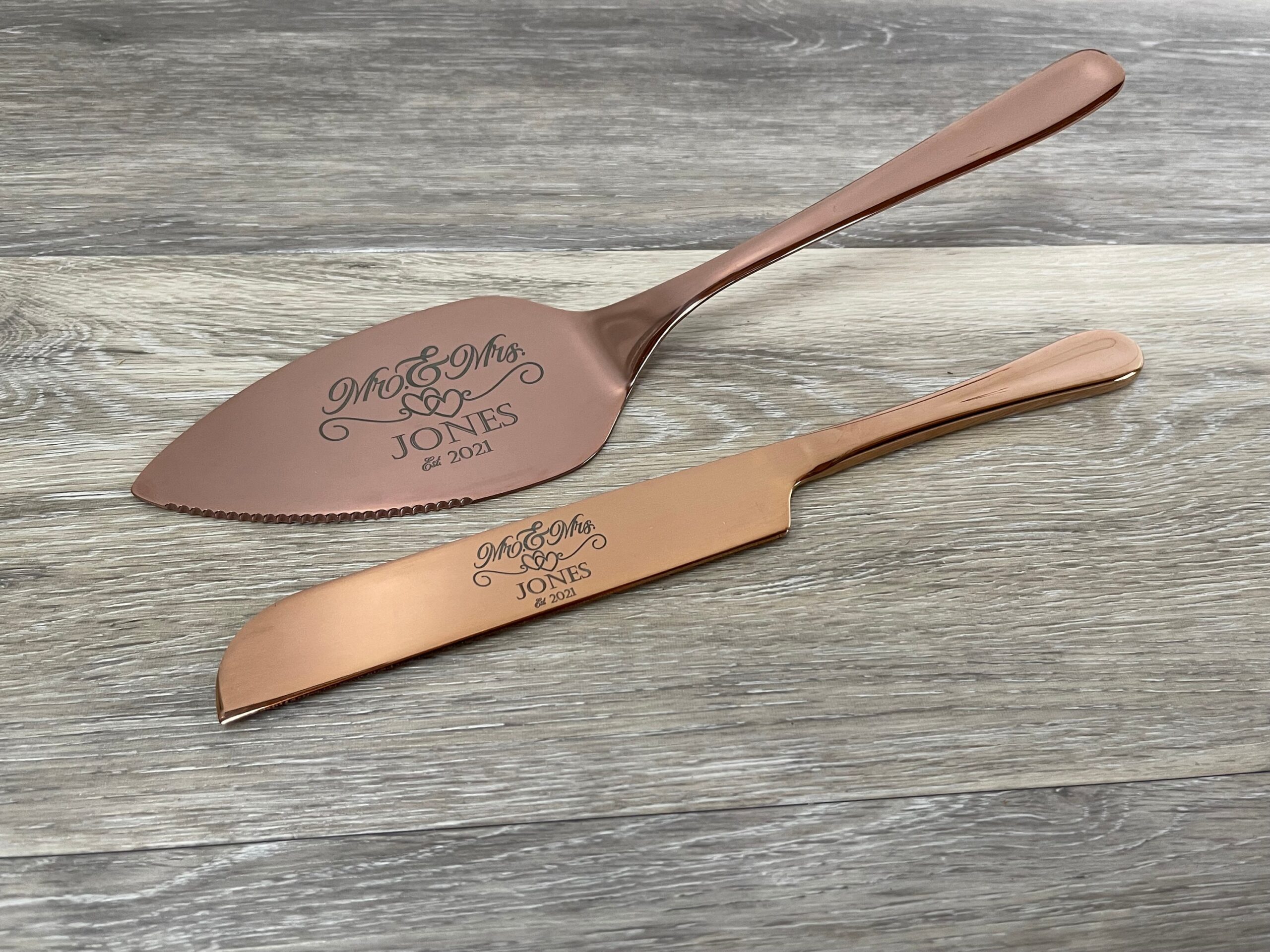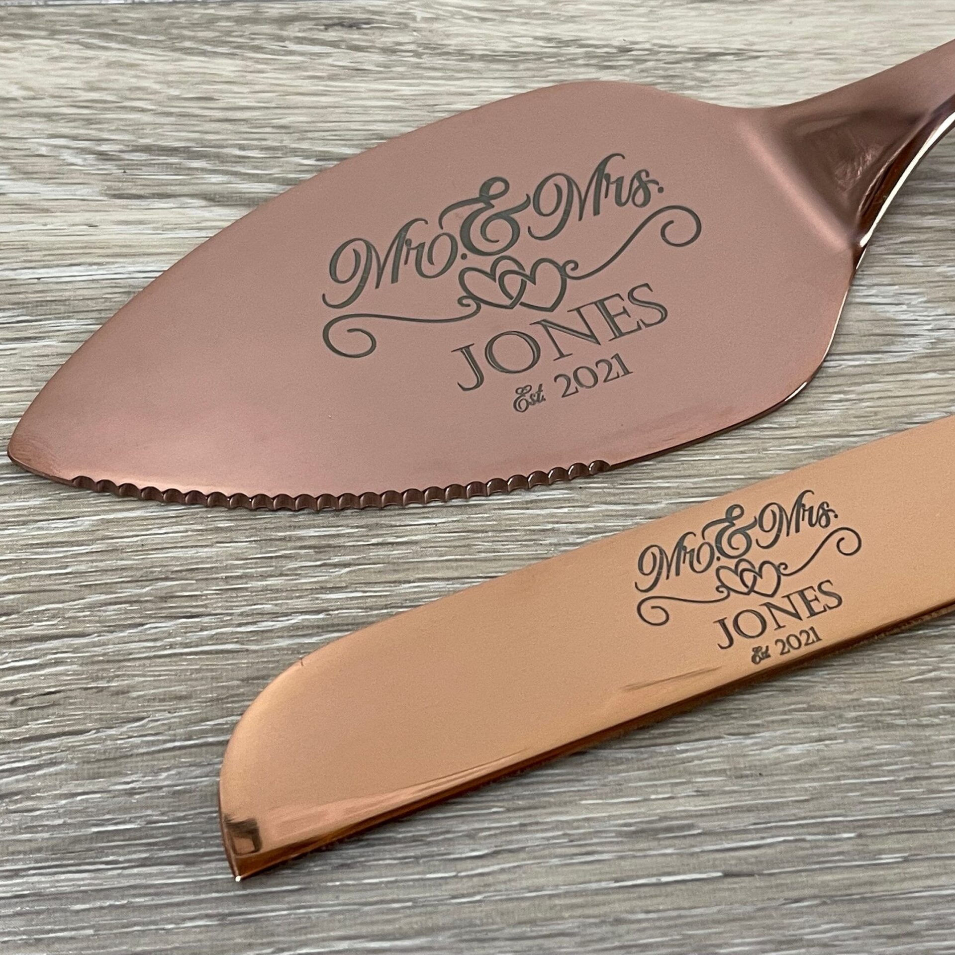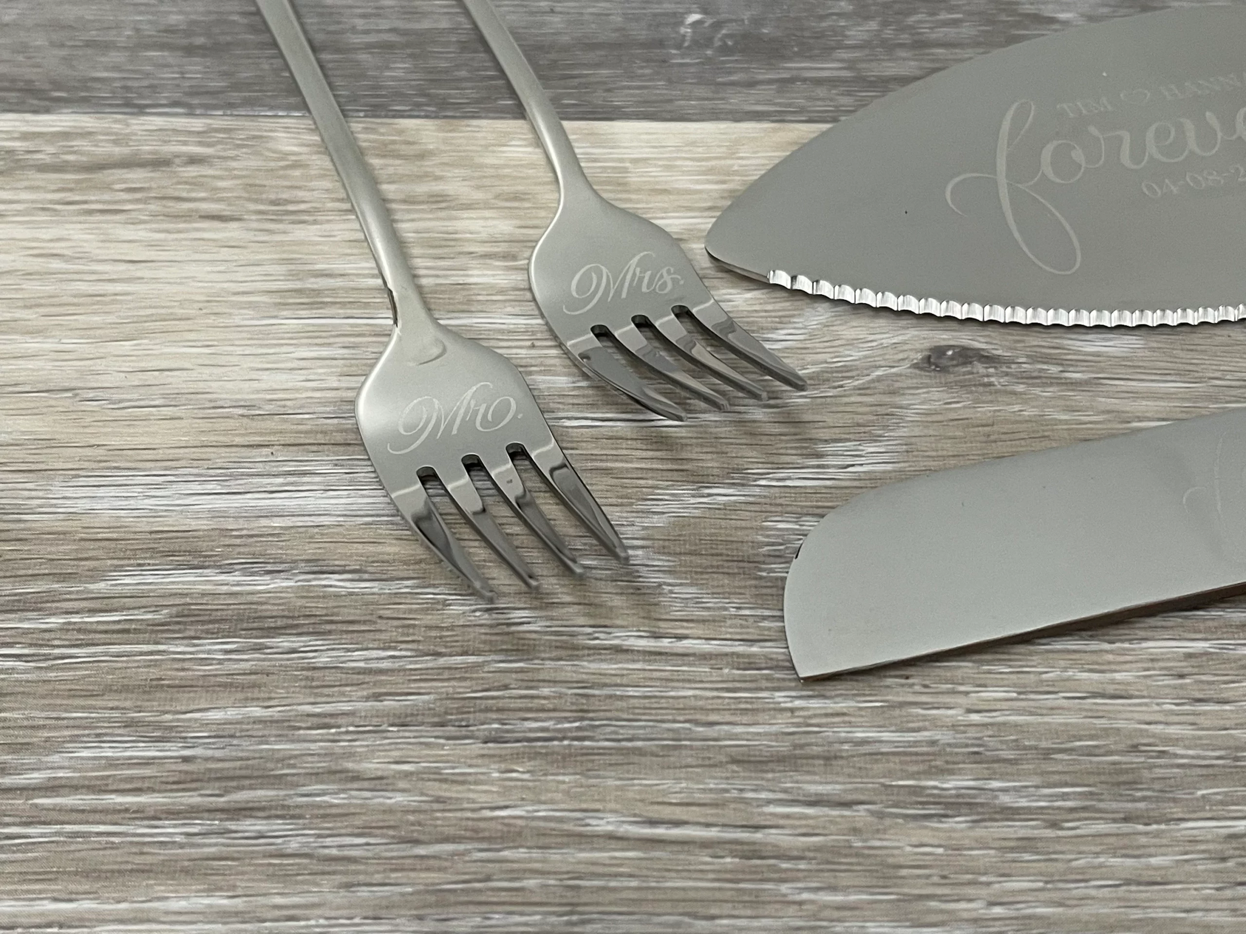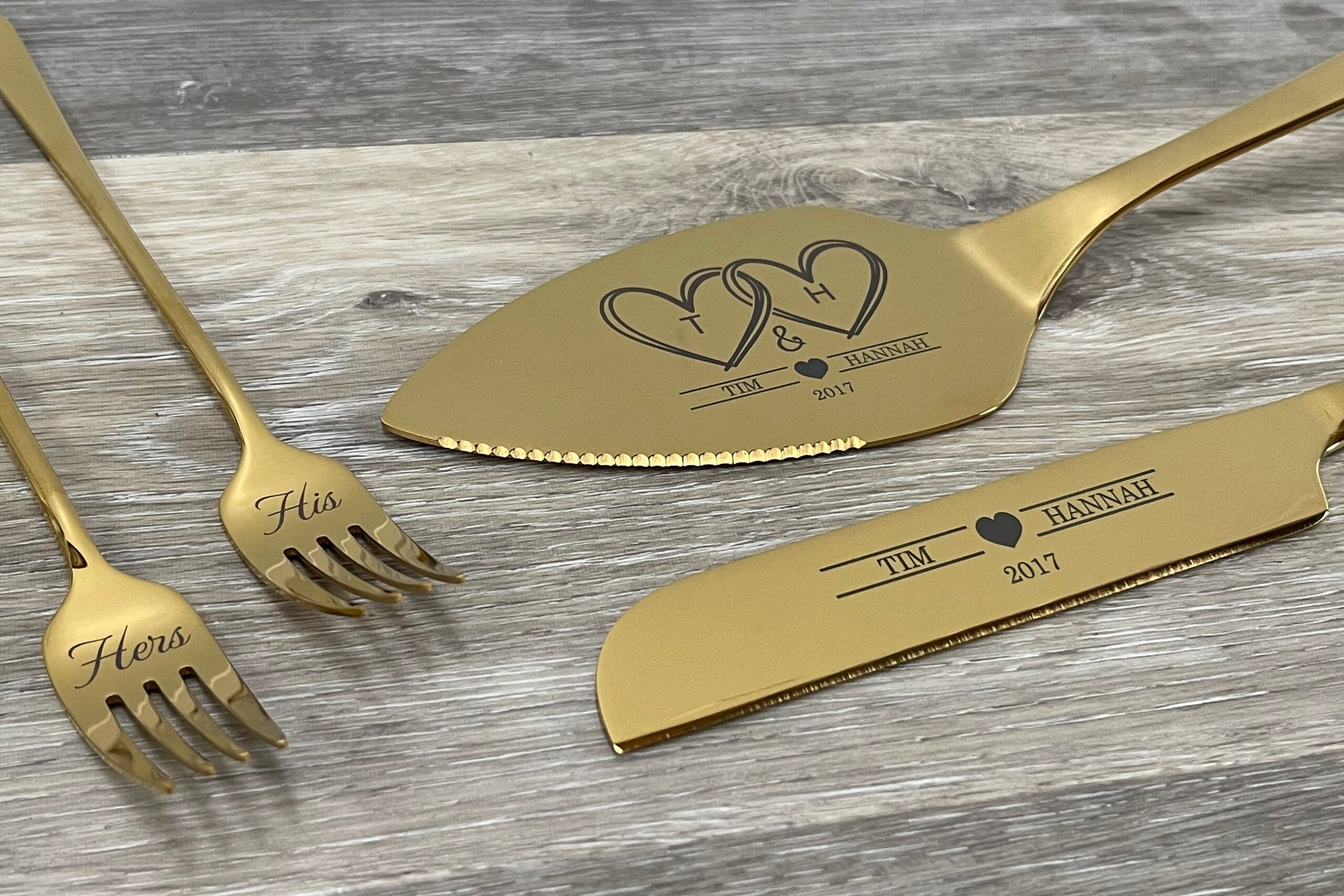 Presenting our beautiful custom engraved cake knife and server sets with 2 dessert forks, perfect for adding an extra touch of elegance to your special celebrations! Choose from our selection of premade designs or submit your own design for a truly unique keepsake. Available in 4 stunning colors, these sets make a thoughtful and personalized gift for weddings, anniversaries, birthdays, or any momentous occasion.