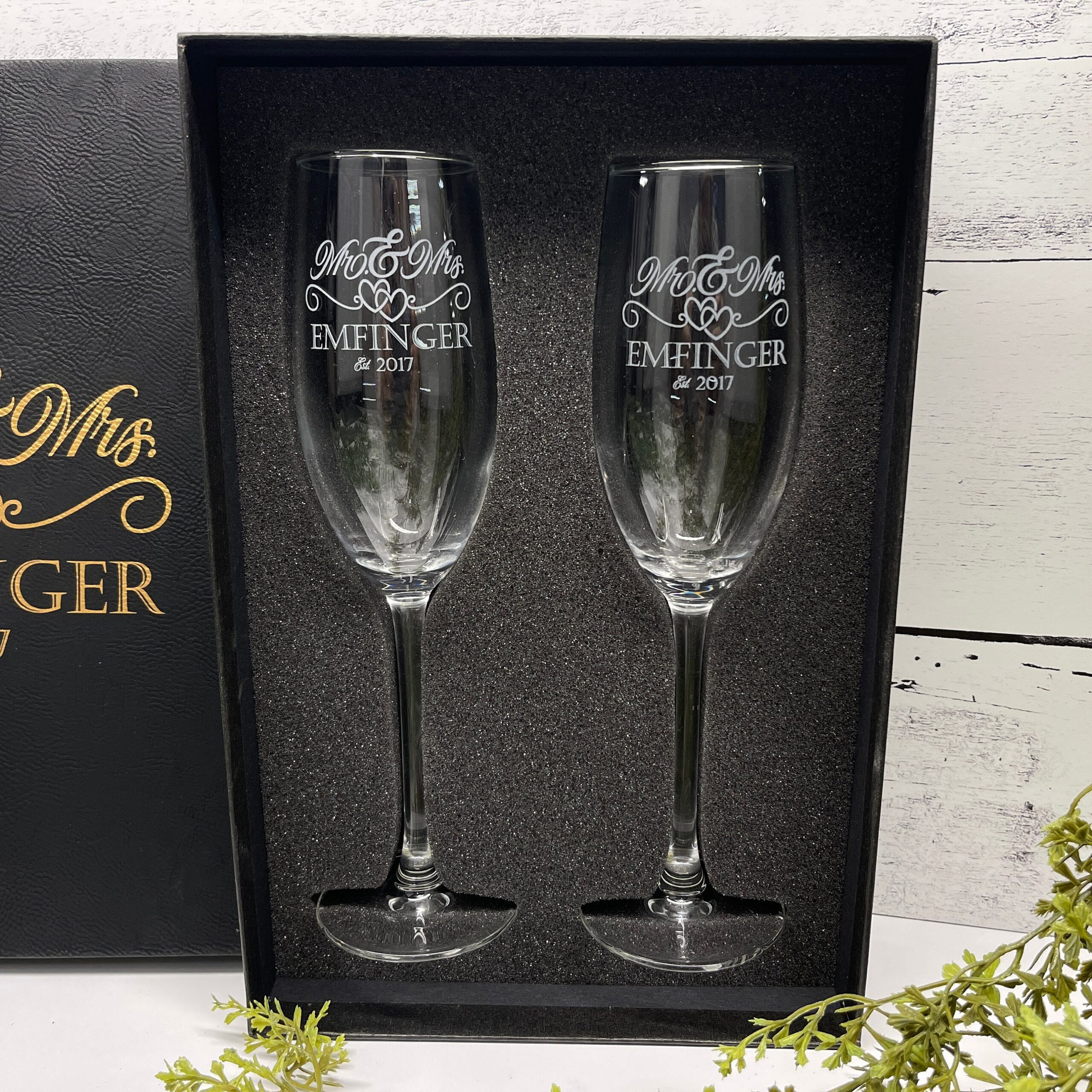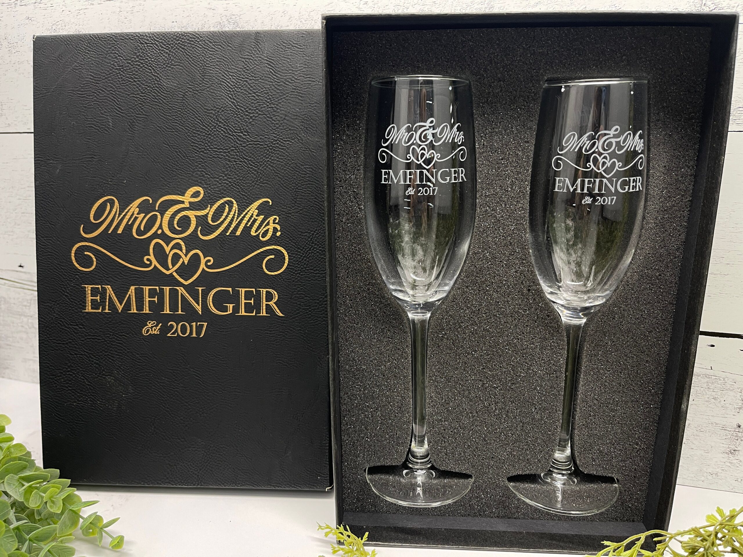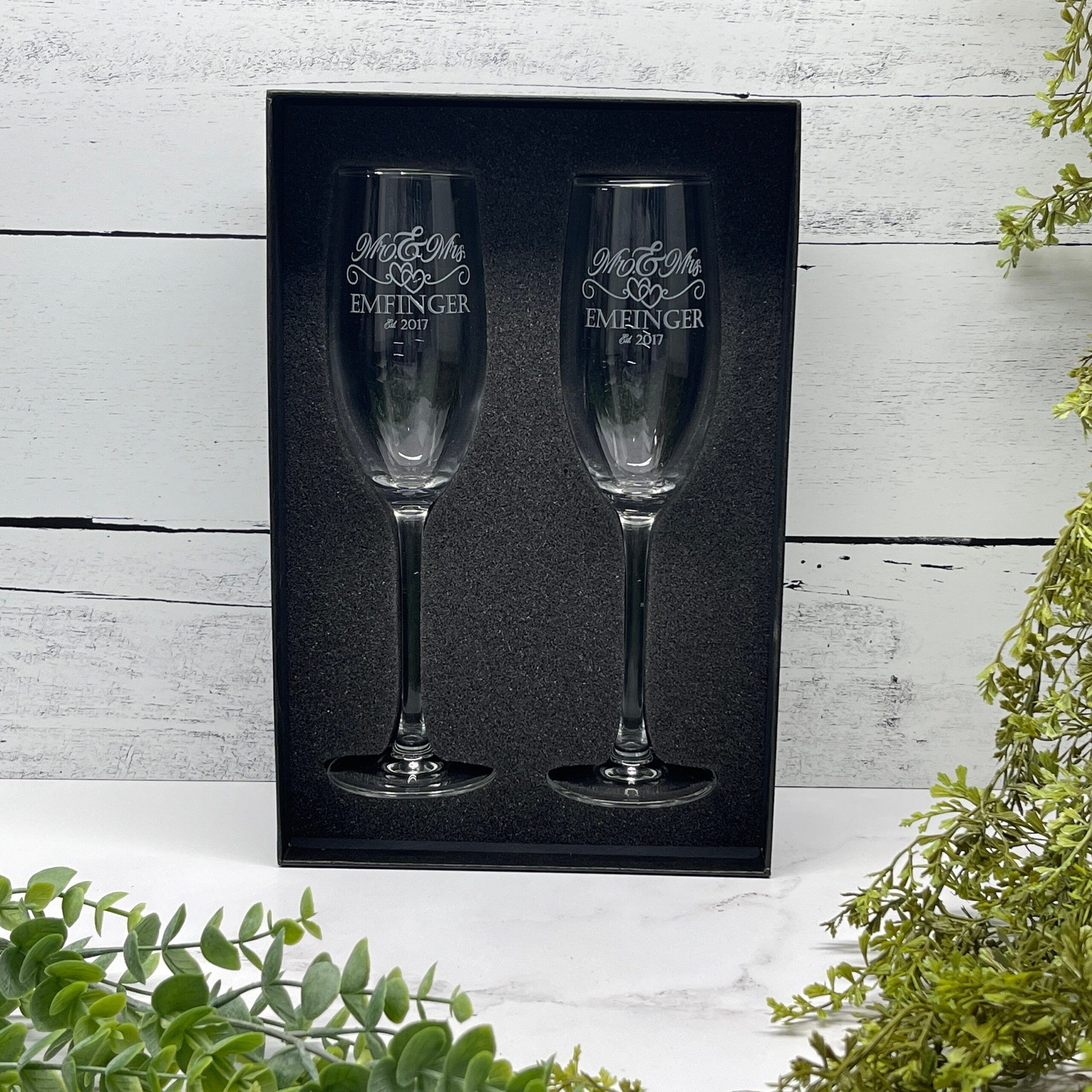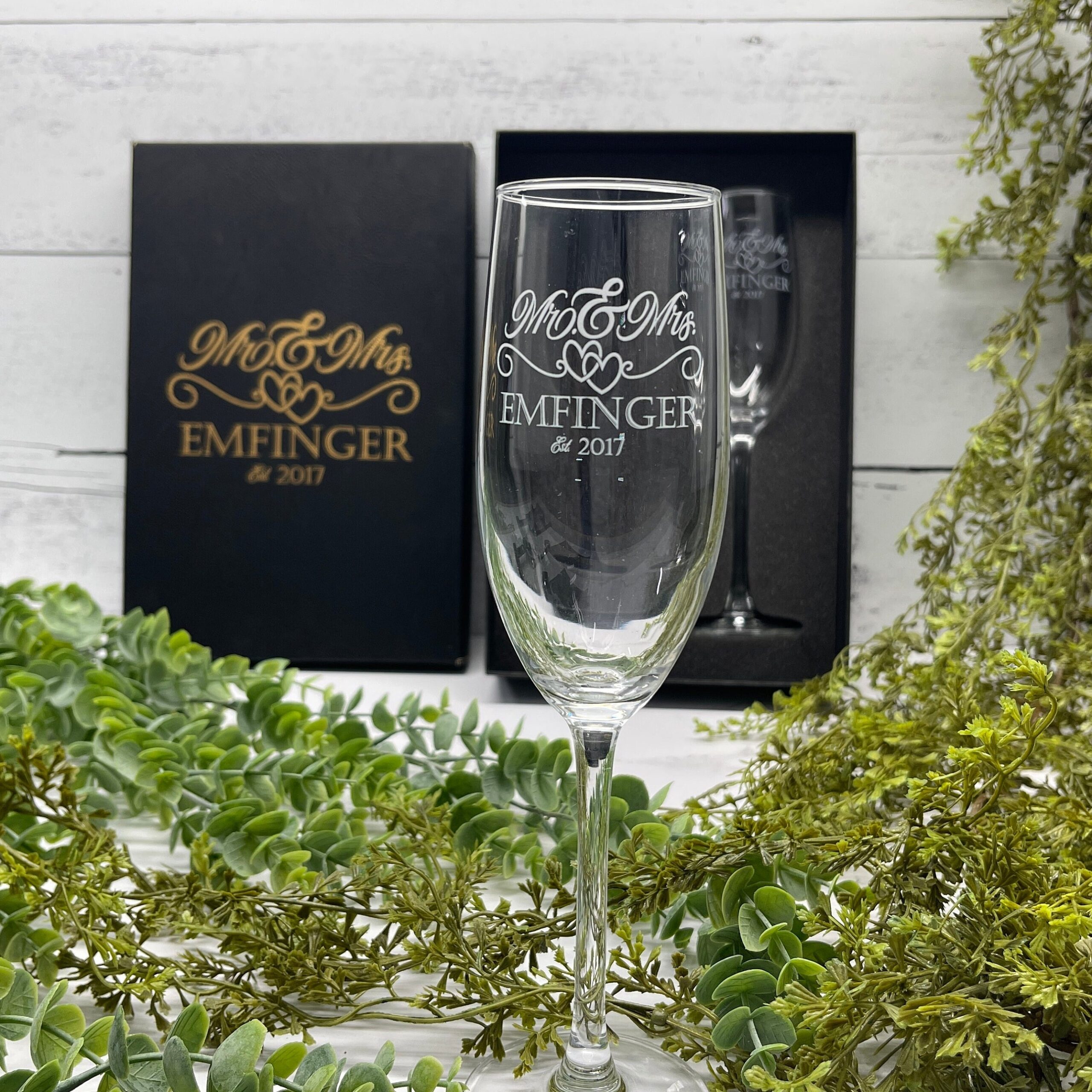 Celebrate your special day in style with our elegantly engraved Mr. & Mrs. Champagne Flutes, the perfect addition to your wedding toast and a timeless keepsake to cherish for years to come. Handcrafted with precision, each glass is meticulously etched with your last name and the year of your union, making them as unique as your love story.