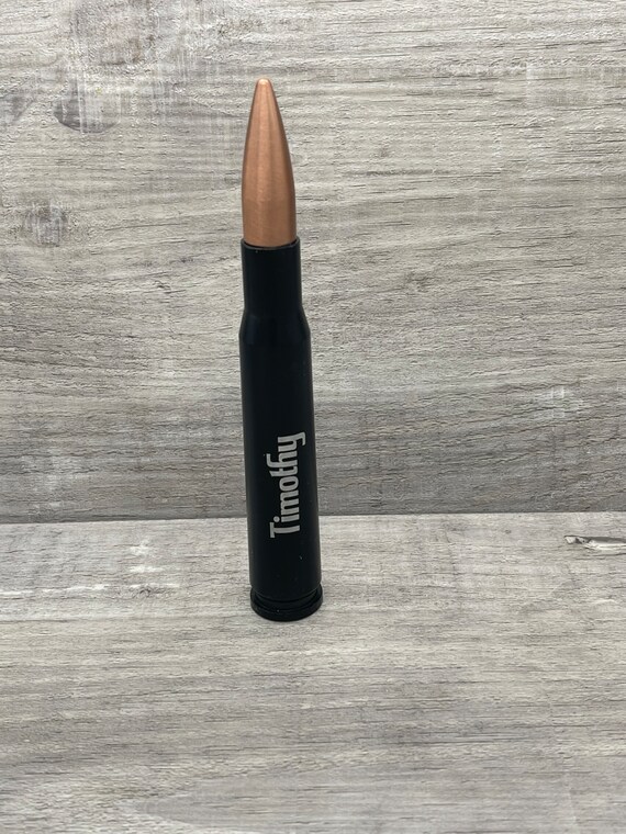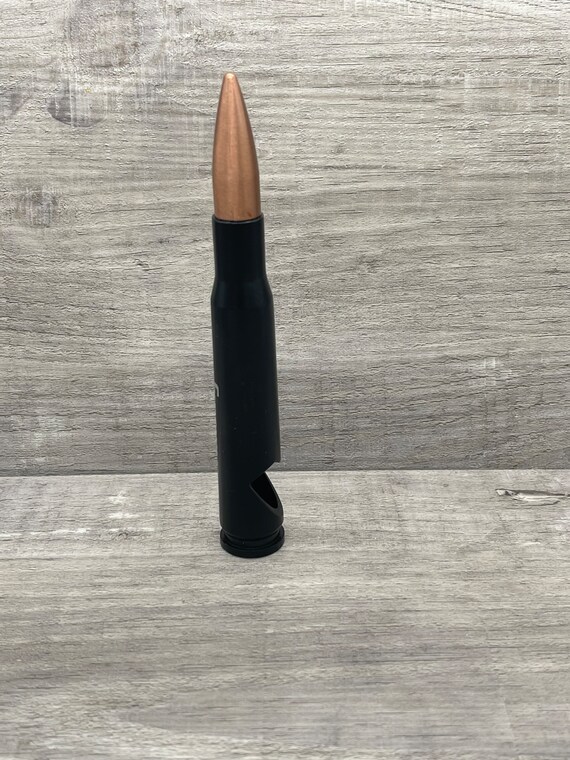 These .50 Caliber Bullet Shaped bottle openers are fully personalizable, and true to size. We currently only offer the font shown as a standard font since this is a new item, but we are accepting custom requests via message. These are LASER ENGRAVED, no vinyl stickers or decals are used. The black powder coating is engraved away leaving the silver color underneath showing. For that reason, these cannot be engraved in different colors.