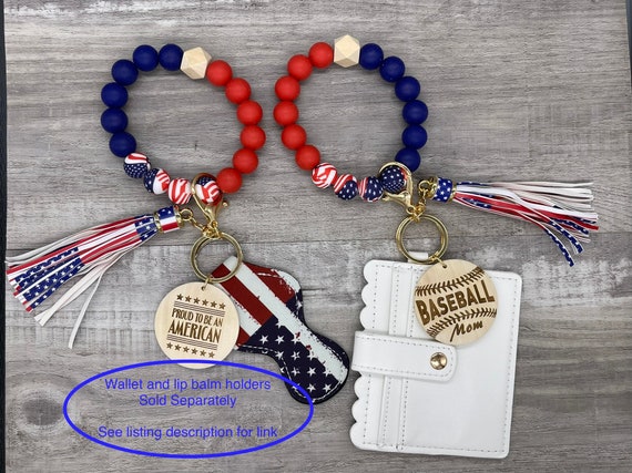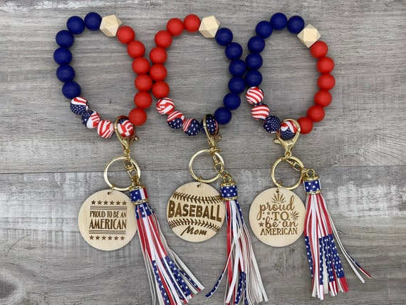 These wristlets are personalizable, or we have graphics that can be engraved. The beads are made of silicone so that they fit more comfortably on your wrist, and have an American Flag print on some of the beads and on the tassel. They are only engraved on one side. The wood discs are roughly 2 inches in diameter.