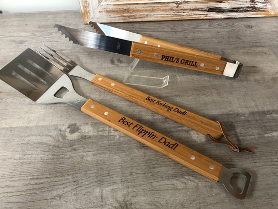 These BBQ grilling tools are great for dad or grandpa! They can be personalized with any short message, or engraved as shown on request. We have 2 different spatulas available: the standard length has serrated edges on both sides with a bottle opener on the front, and the Extra Long Spatulas are…well…extra long to keep your hands further away from the heat, and have a bottle opener on the front and back of the handle. Since the standard length spatulas are new, they are not currently pictured on our main image, but can be seen in subsequent images. The turning fork and tongs are great for flipping the food that just doesn’t turn as well with a spatula.
