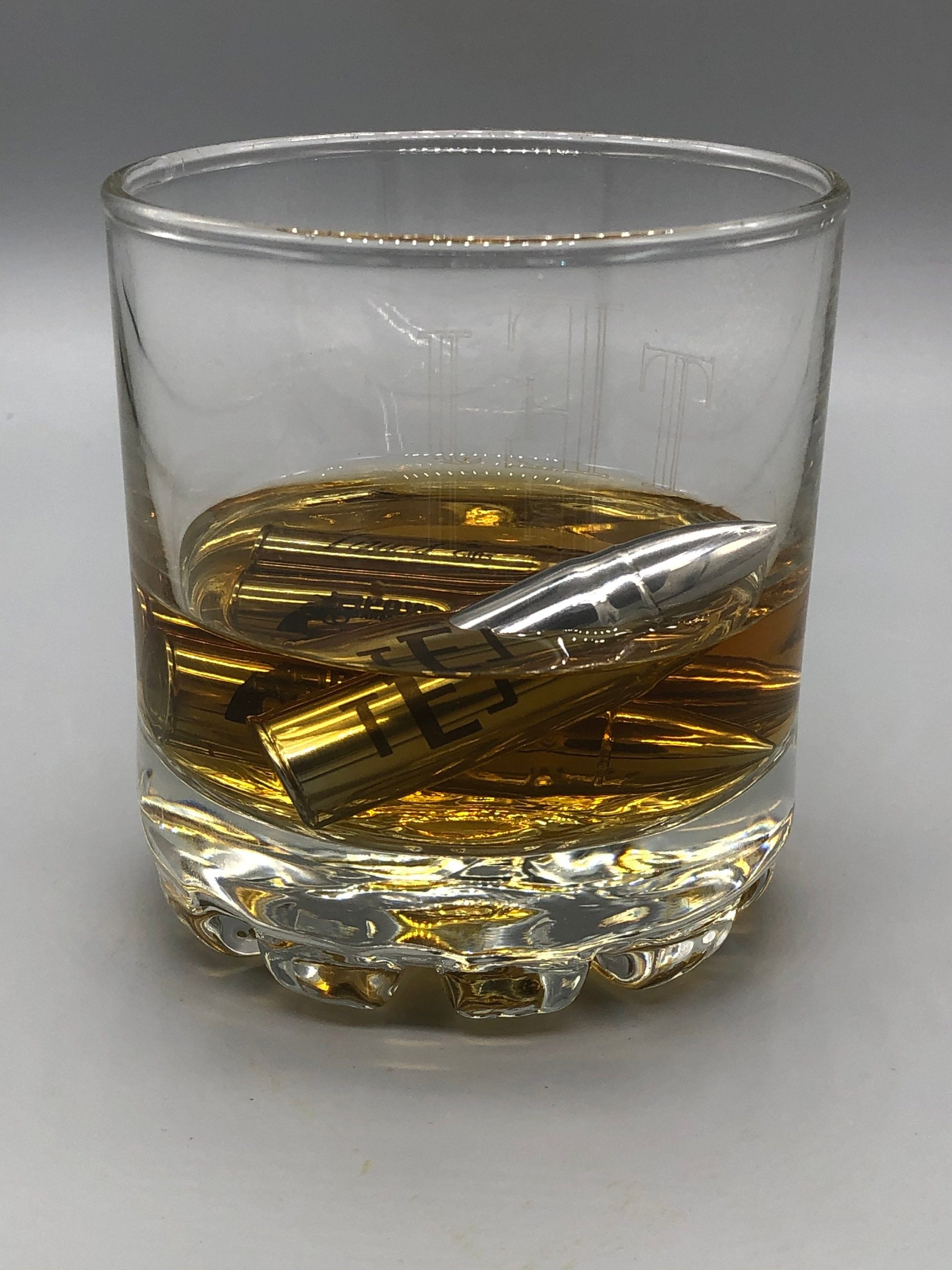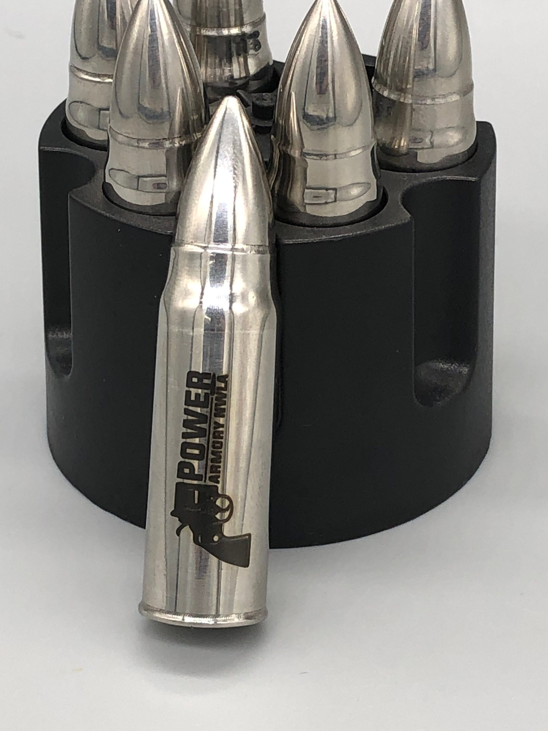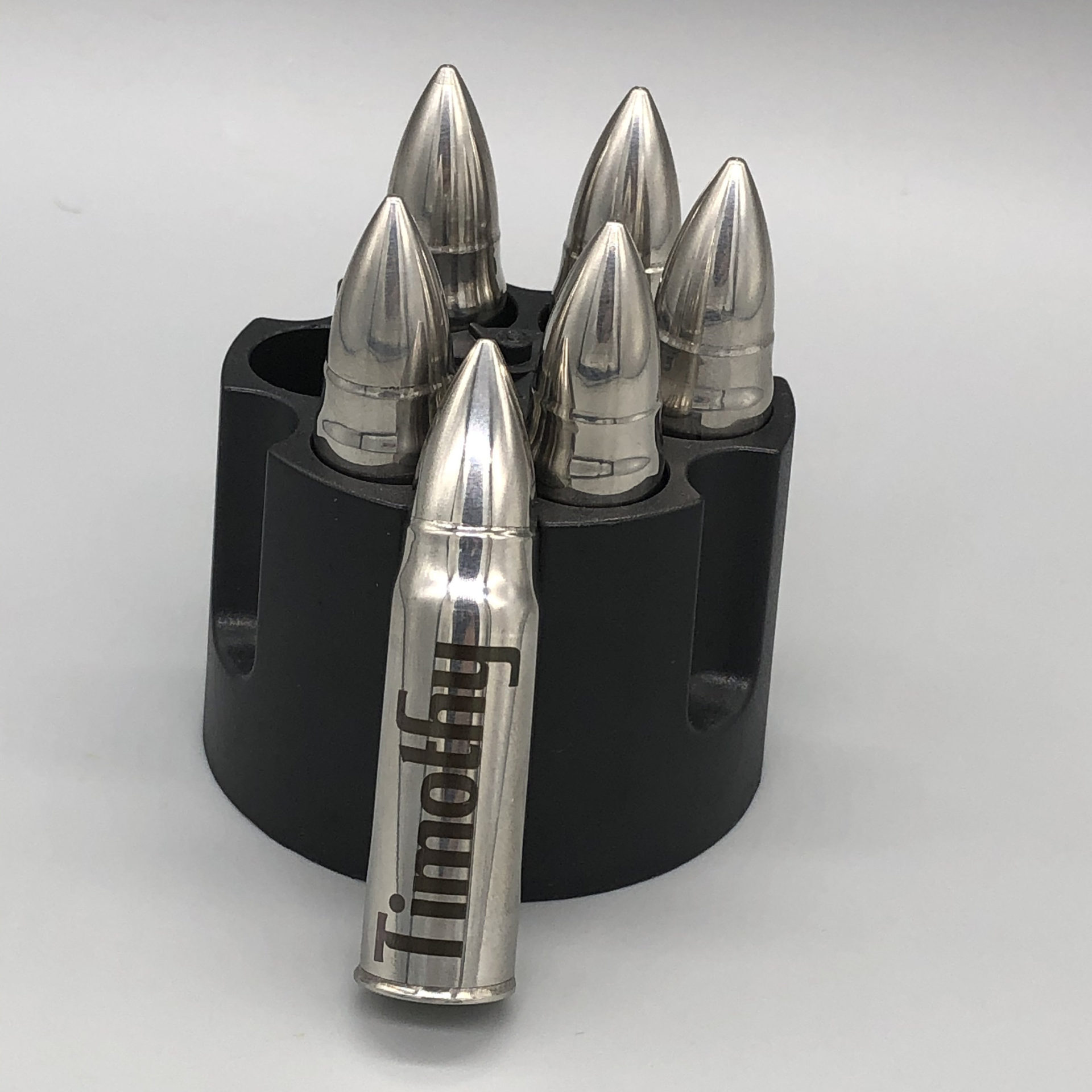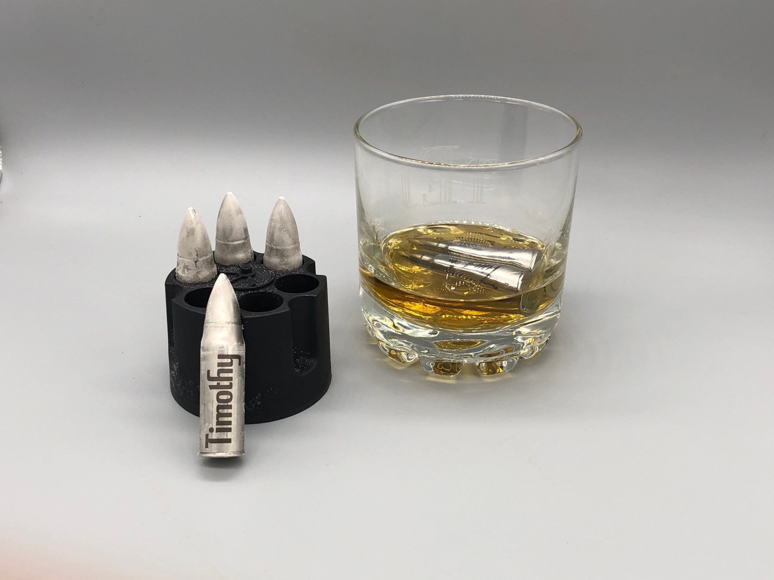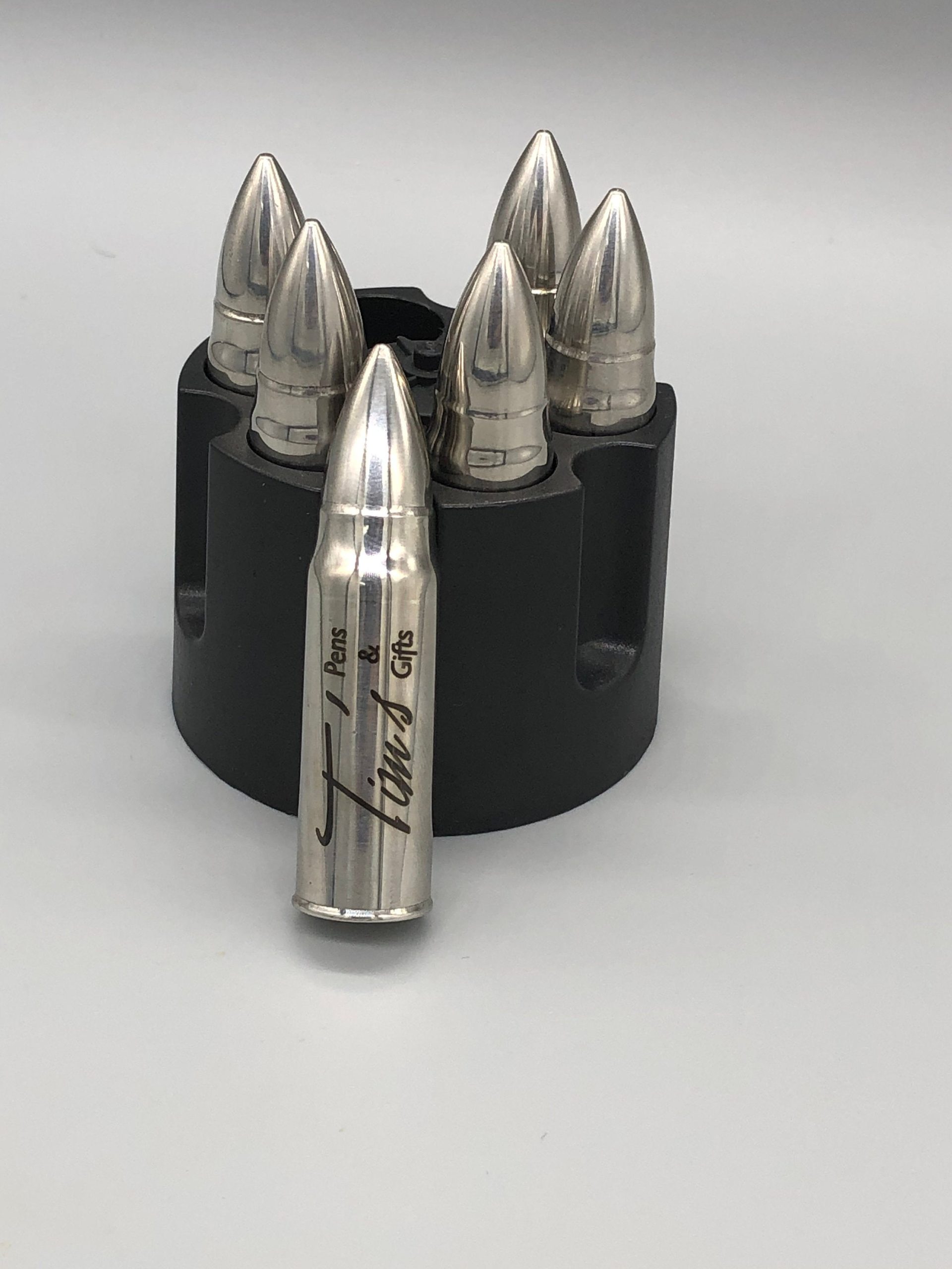 These bullet shaped whiskey stones can be personalized with a name, initials, monogram, and in some cases a logo or short message. PLEASE SPECIFY IF YOU WANT A MONOGRAM (middle letter largest) and include all characters in the order they should appear. If you do not specify that you want a monogram, orders with 3 characters will be engraved as initials. These are personalized by utilizing a laser that permanently alters the color of the stainless steel. These are NOT made with vinyl stickers or decals. They come in your choice of a 3 pack or a pack of 6; the 3 pack comes with a black fabric drawstring bag, and the 6 pack comes with the revolver shaped holder that’s pictured. All stones in a set must be engraved the same. Each stone is roughly 2.25″ tall, and 1/2″ diameter at the base.