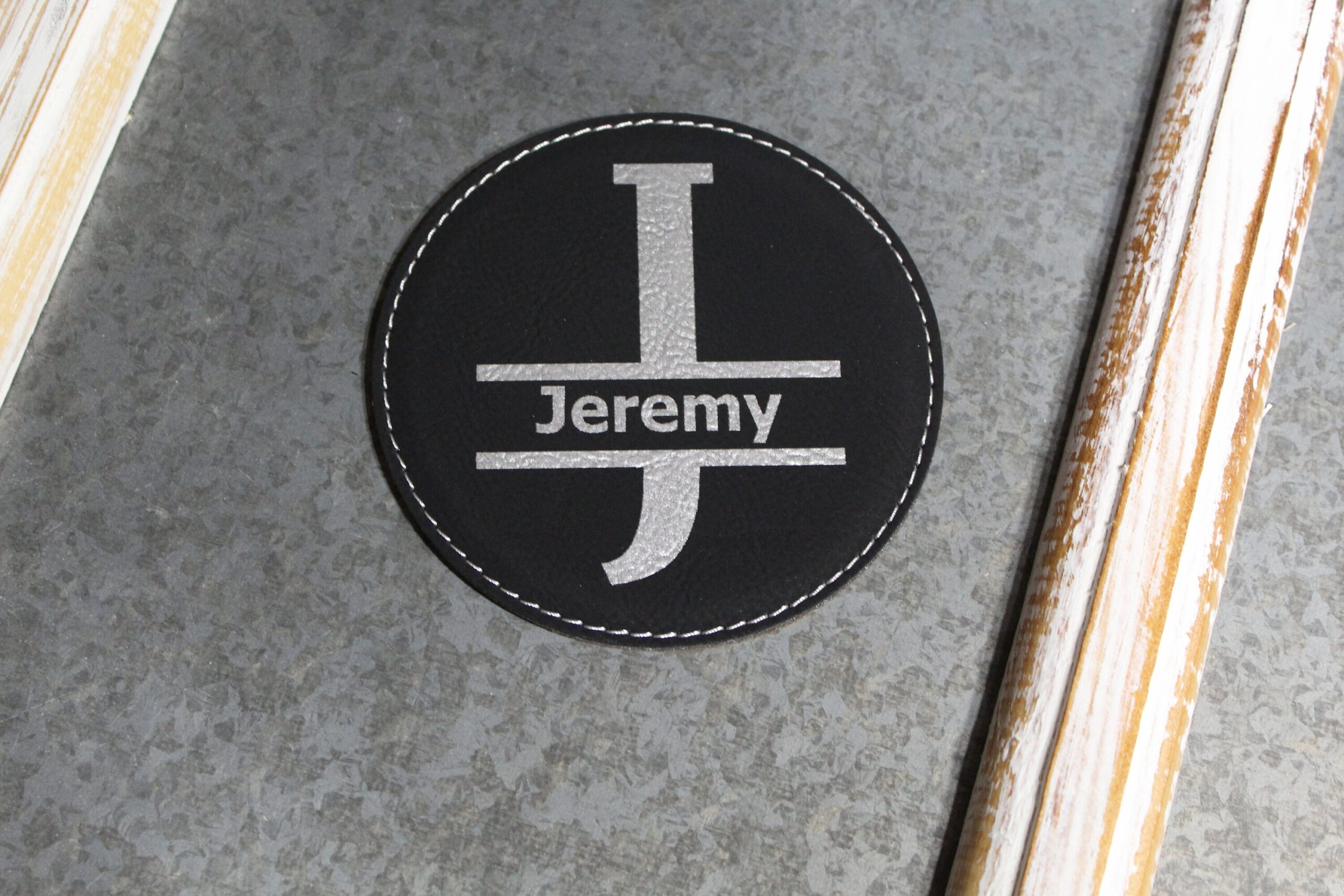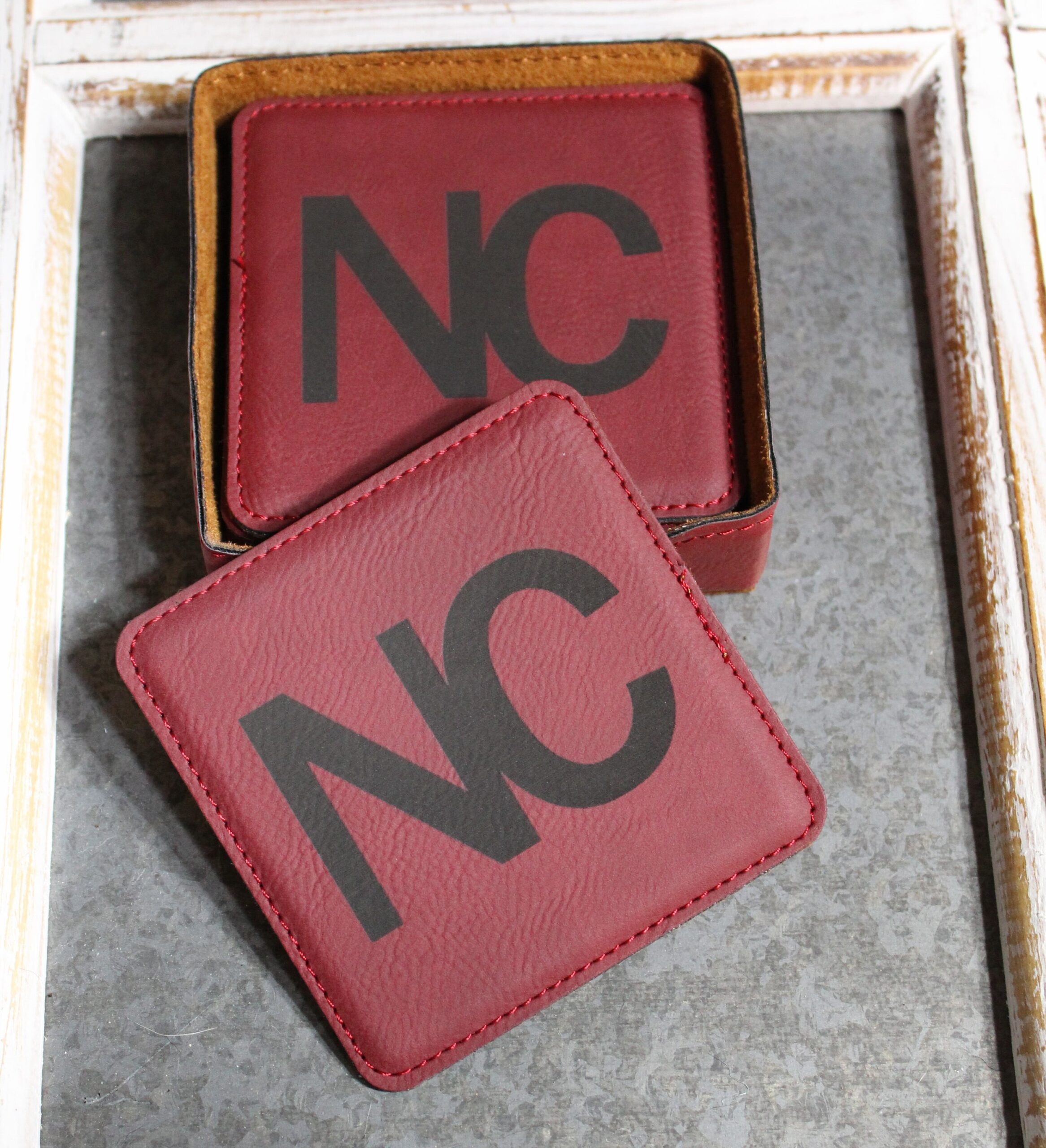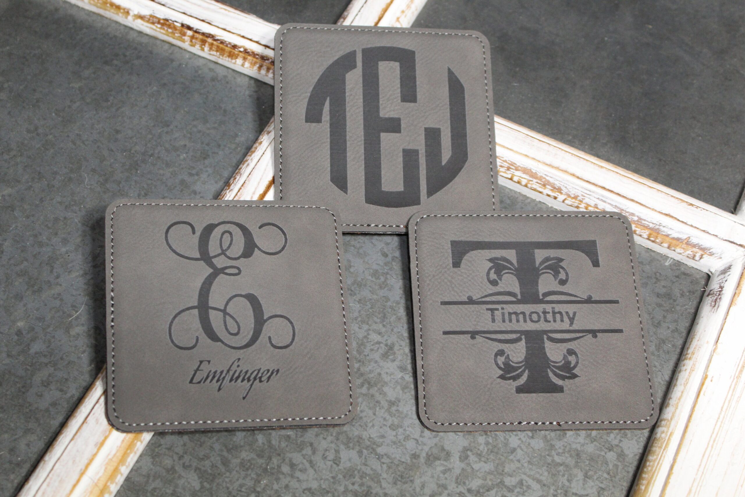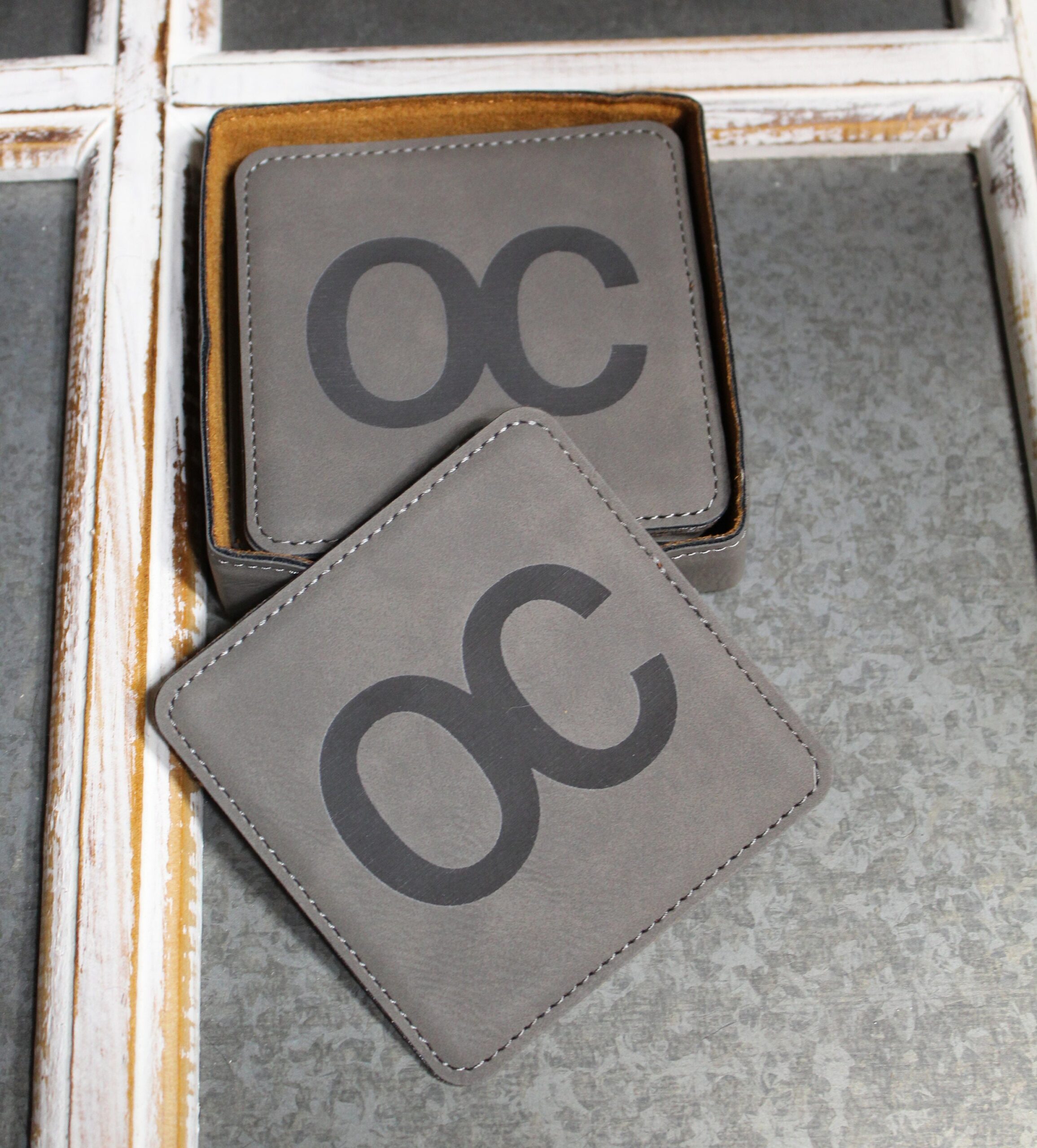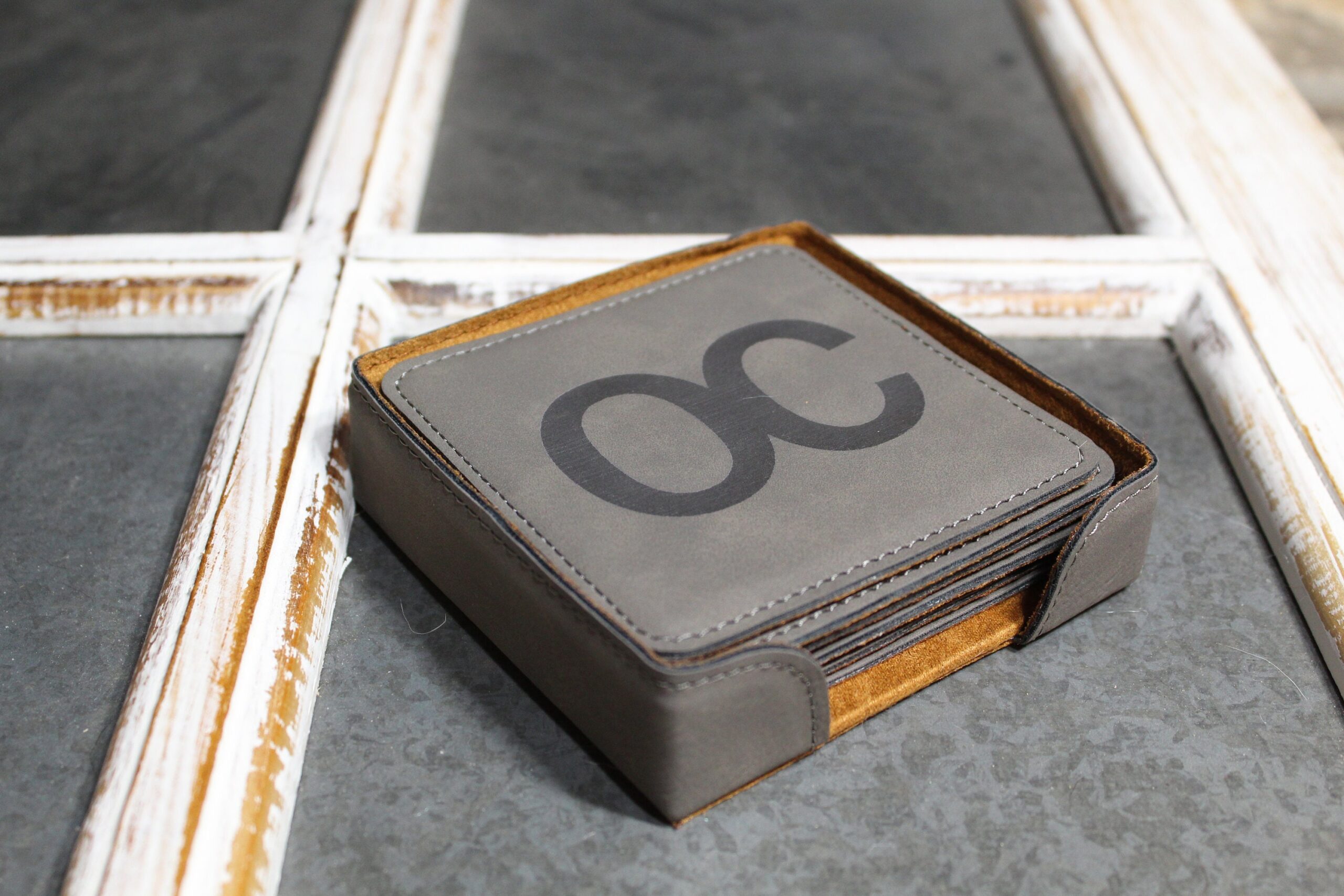 These coasters come in a set of 6, and include a matching storage caddy. They are made from a high quality leatherette material, and personalized with your monogram, large single letter, pretty much anything! As a standard, we have 6 styles to choose from, an outlined template is shown in the last image, but can usually do more custom work as well. Please note that the outlines will be filled in, just like the samples shown.