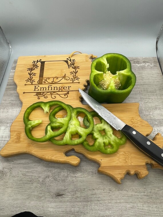 These cutting boards make great gifts for mom, couples, and anyone buying or decorating a new home. They are made of thick bamboo, which is naturally moisture resistant making it ideal for kitchen use. These are handwash only, and should never be put in a dishwasher.