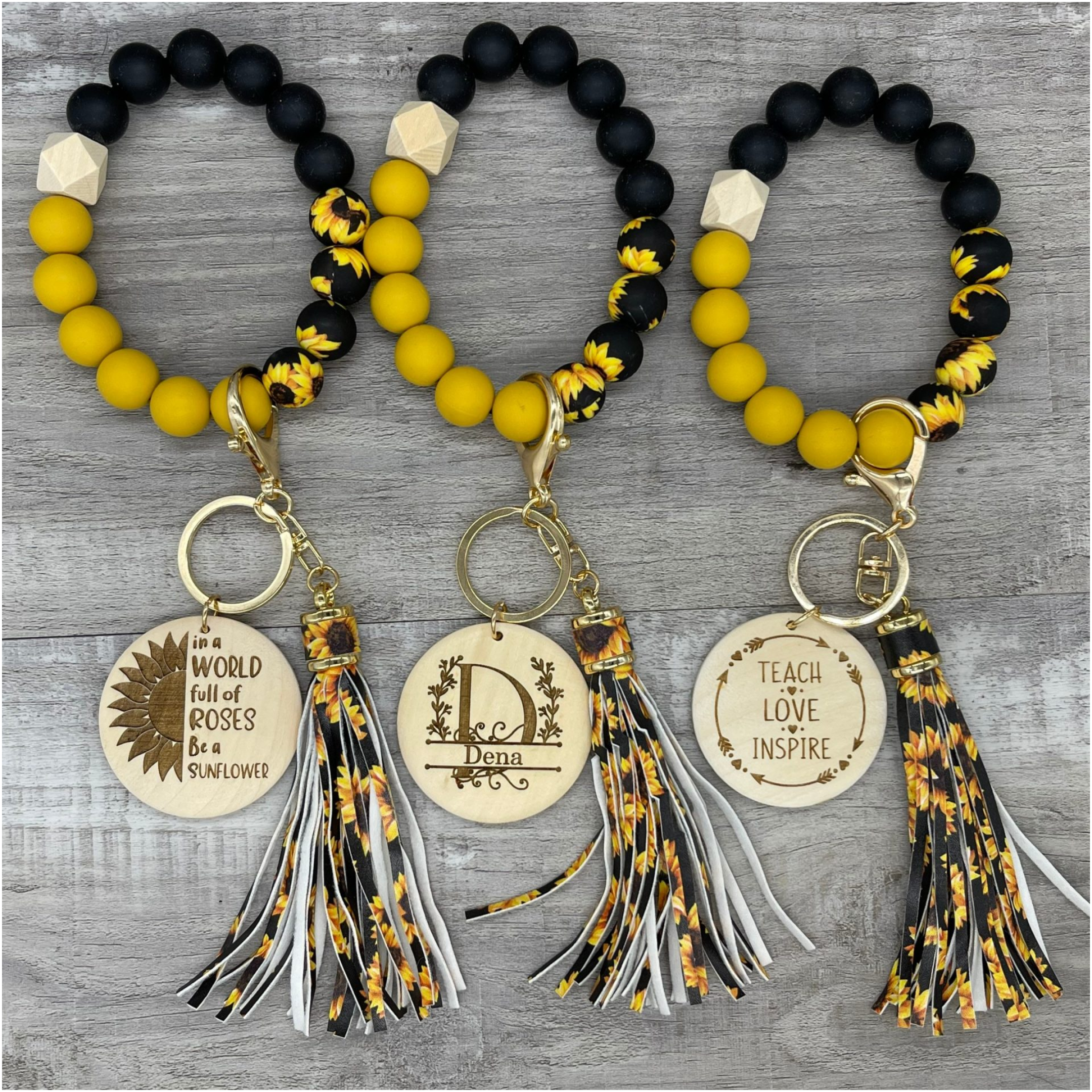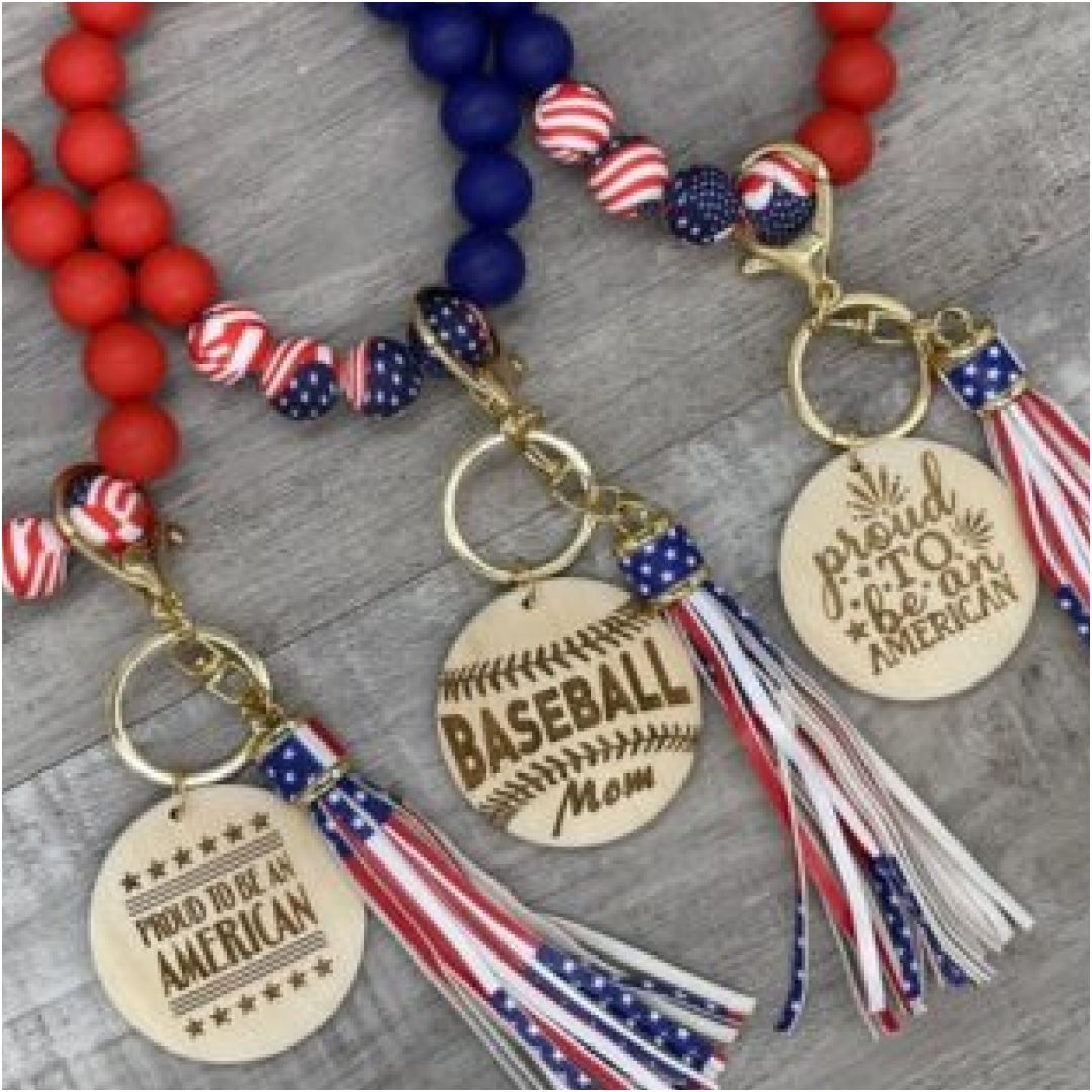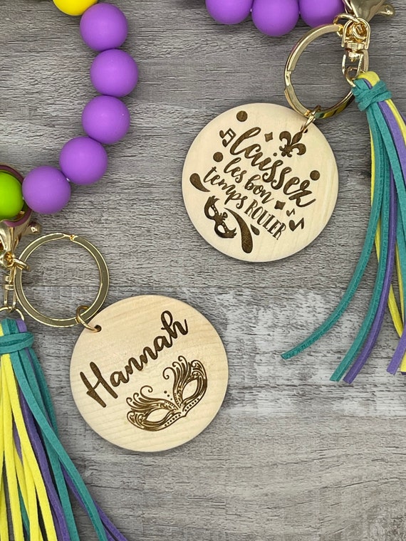 These wristlets are personalizable, or we have graphics that can be engraved. The beads are made of silicone so that they fit more comfortably on your wrist, and are made with Mardi Gras color beads and tassel. They are only engraved on one side. The wood discs are roughly 2 inches in diameter.