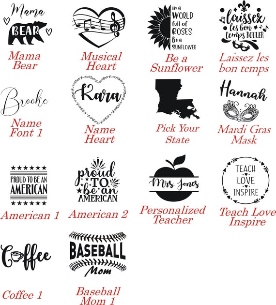 If you have your own SVG image, we would be happy to engrave it for you as long as it doesn’t violate any copyright laws. You can also search Etsy or Google for your own SVG files to send to us. We do ask that you send the file over to us BEFORE ordering so that we can ensure that it will engrave well, but in most cases we can.
