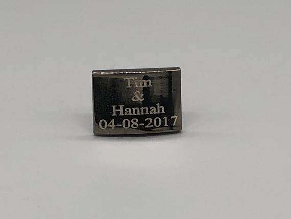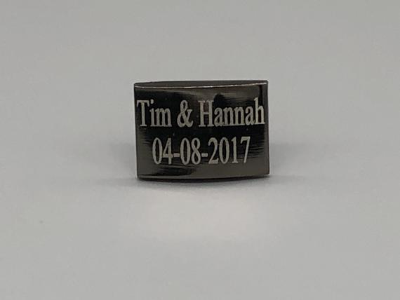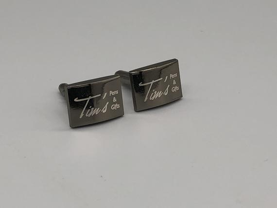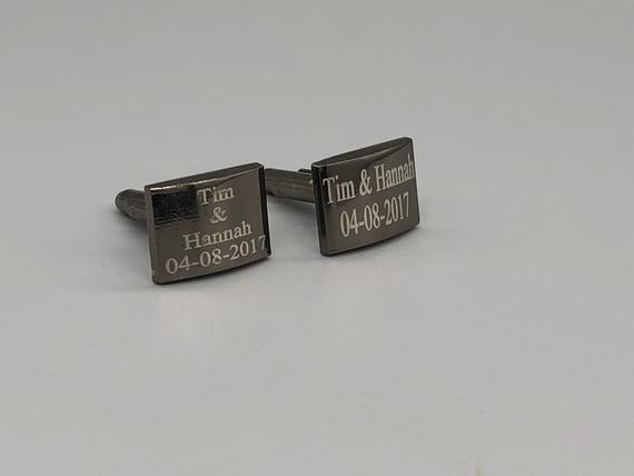 These cufflinks are made from stainless steel, have a high gloss black metallic color plating, and are laser engraved. Each set can be engraved with up to 4 lines of text with a maximum of 12 characters per line (including spaces).