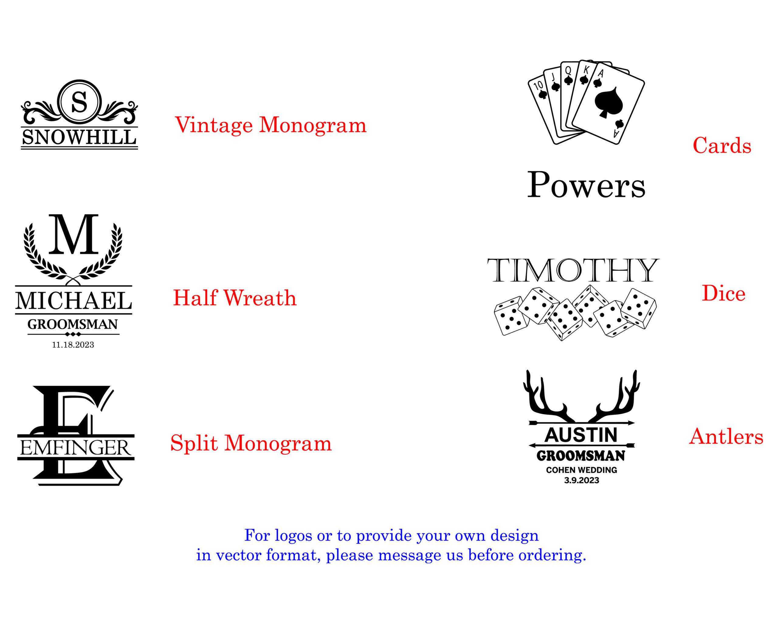 They can be personalized with any of our standard design options. If you would like your own design or logo engraved, please email it to us before ordering so that we can ensure it’s a good fit. Vector files are preferred, but many high resolution images will work too.