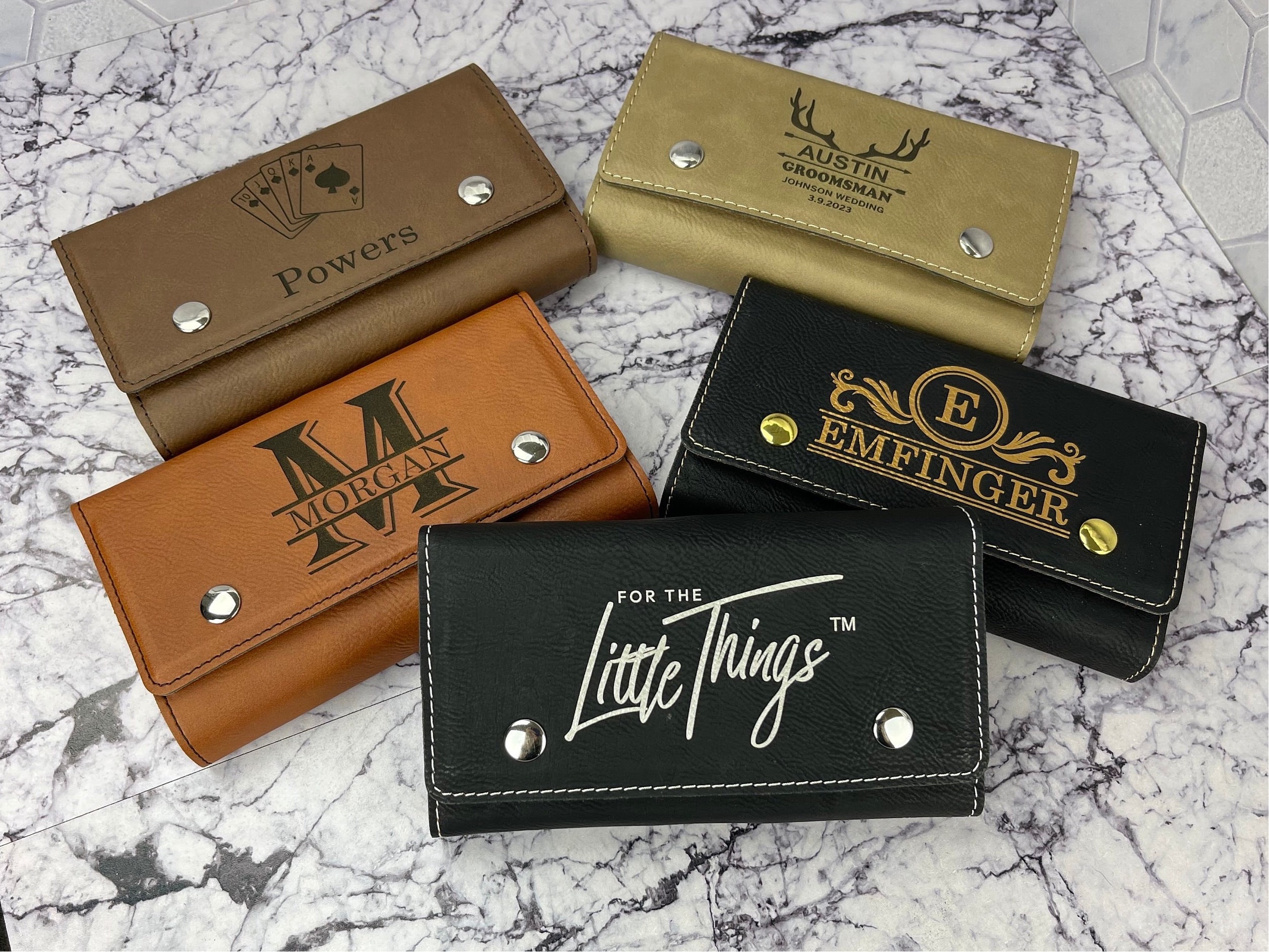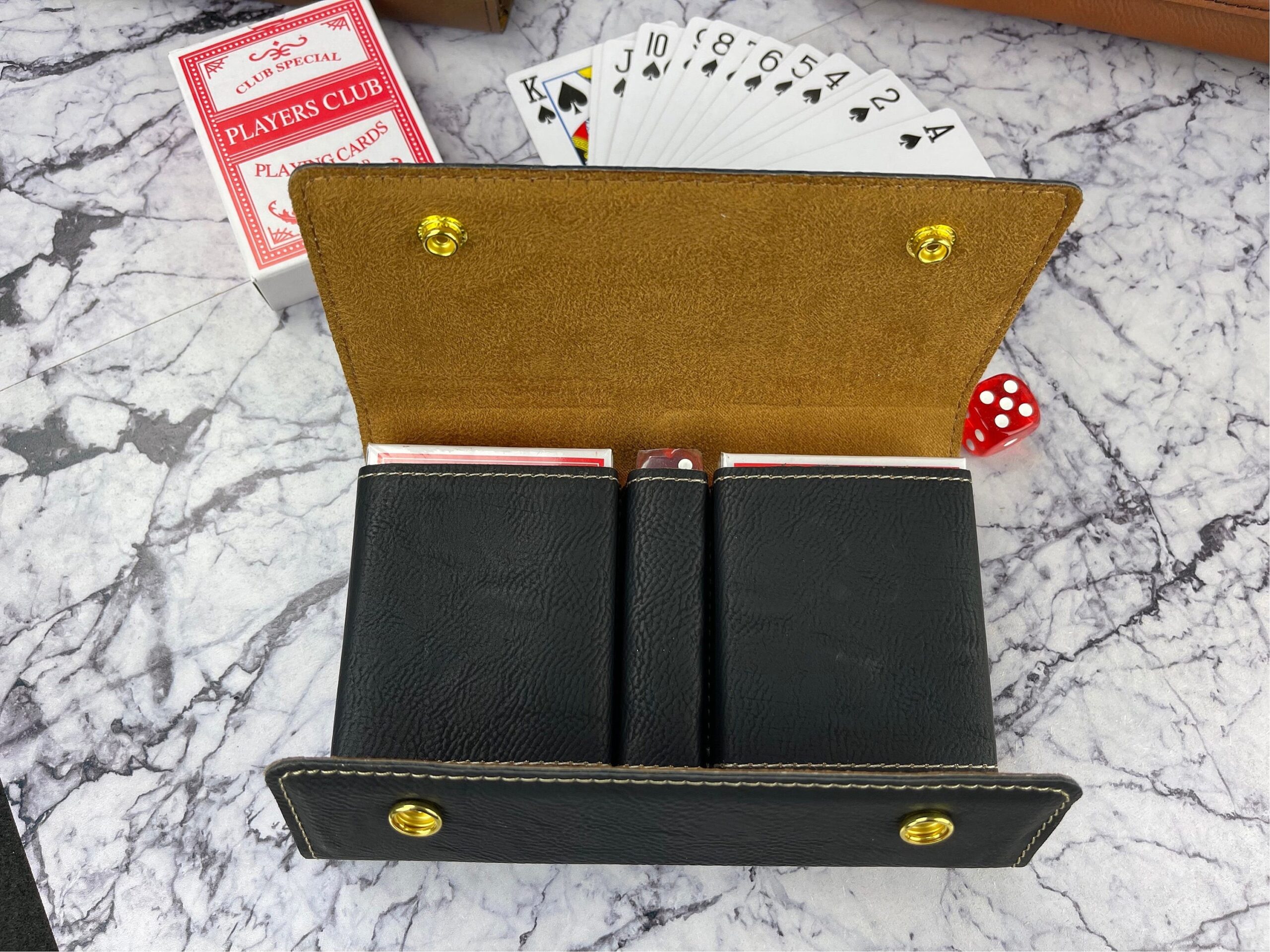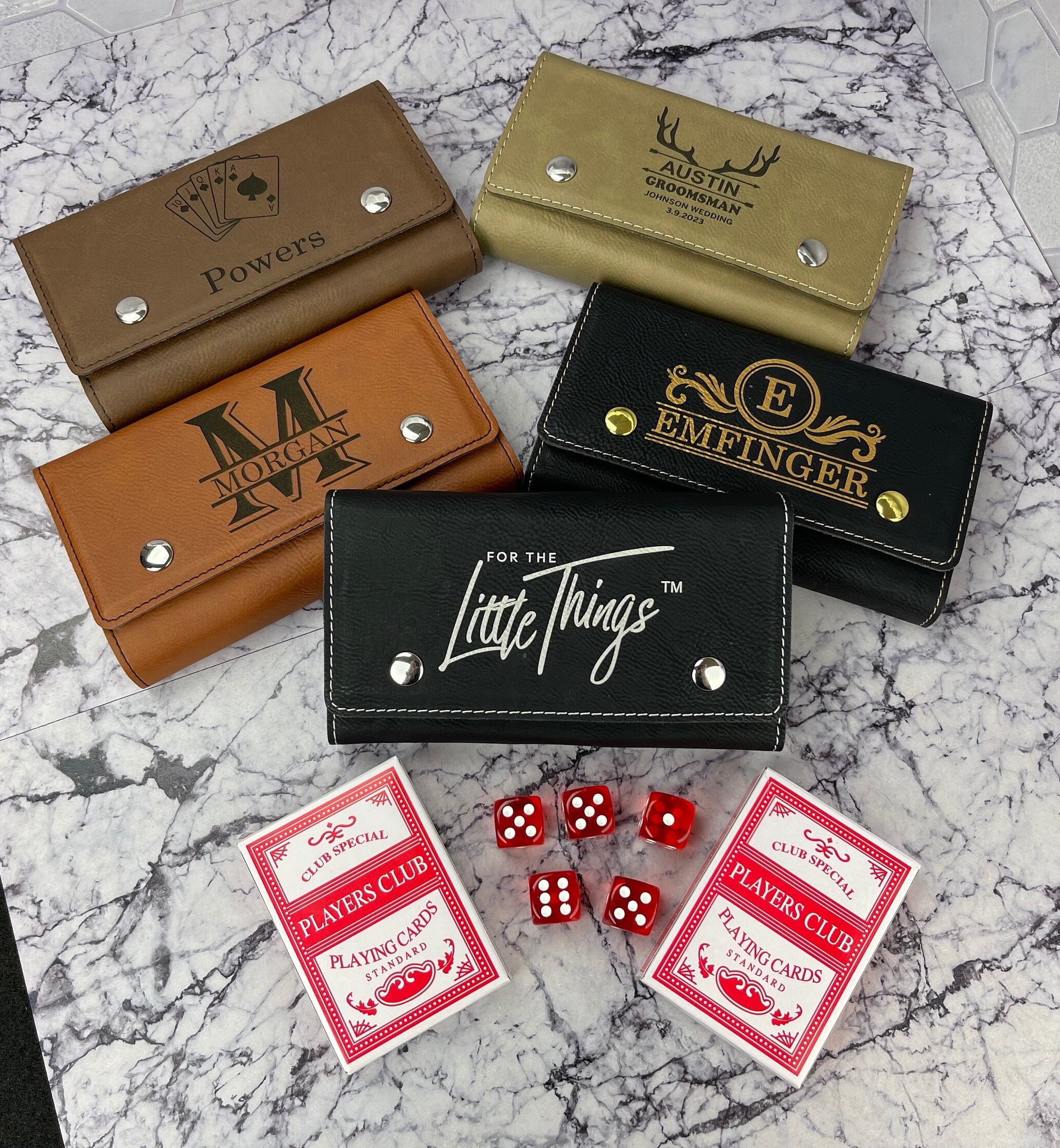 These card and dice holders are made from high quality leatherette. They snap shut, hold 2 decks of cards, and 5 dice (all included). These are laser engraved! No vinyl stickers or decals are used.