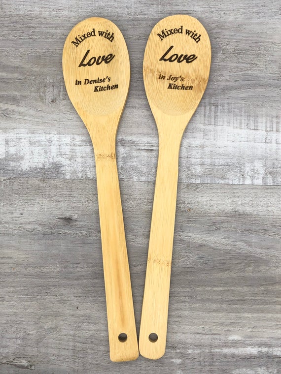 These wooden spoons are engraved with “Mixed with love in *insert name’s* kitchen”. They are made from bamboo, which is naturally moisture and bacteria resistant. These make great gifts for anyone who loves to cook, or spends a lot of time in their kitchen.